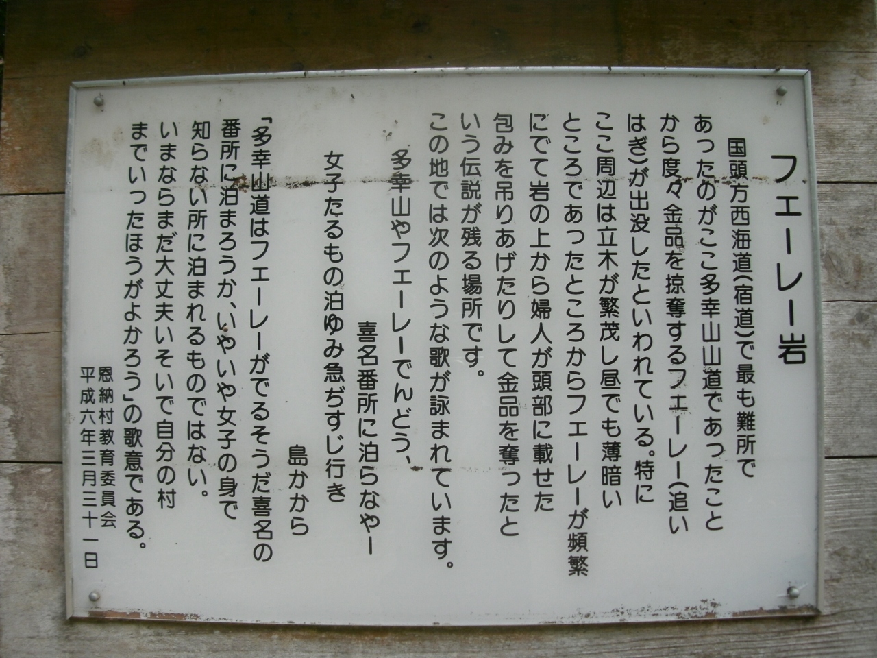 県道6号線を読谷村の方から行くと真栄田のバス停近く、真栄田商店の前辺りで右に入る地道を進み真栄田公民館の前を過ぎ、小さな川を渡ってどんどん進んで行くと「フェーレー岩」があります。“フェーレー”とは、沖縄の言葉で“盗賊(山賊)”と言う意味で、「フェーレー岩」は、琉球王朝時代に国頭方西街道を歩いている旅人を狙い、岩の上にひそんで長いさおの先に鉤をつけて、岩の間の道を通る旅人の頭に載せた荷をひったくったといわれる岩です。
