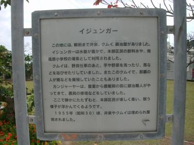 現在は、イジュンガー公園として整備されていて、“織物の町・南風原”を表すように、公園内には草木染めで使う樹木が数多く植えられており、それらを説明する碑が立っています。“かすりロード”散策の祭には、立ち寄ってみて下さい。- 旅行時期