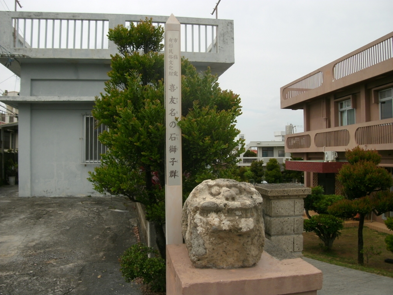 シーサーは住宅街の中にあって、見つけにくいものもありますが、国道58号線の伊佐交差点から県道81号線の普天間方面に登り、2つ目の信号の喜友名部落の入り口に『喜友名の石獅子群』の案内板がありますのでそれを確認してから見学すればよいでしょう。