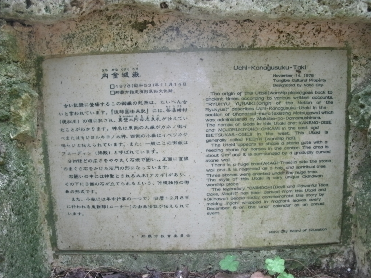 「内金城嶽」は、首里城の南にある赤マルソウ通りから、金城町石畳道に入ってすぐ、左手にある細い地道を案内板に沿って進むと小さな森があり、その中にあります。