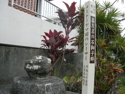 喜友名の集落を取り囲むようにシーサーが置かれ、部落や屋敷内に災いが入らないように見張っています。シーサーは7体あって、怖い顔をしたものや面白い顔つきのもの、中には崩れかけて、ふつうの石としか思えないものもあります。