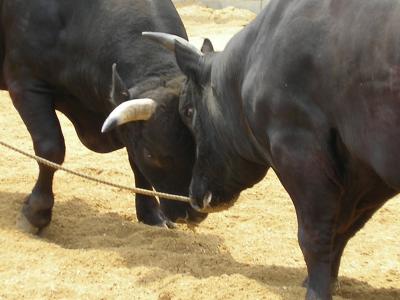 牛と言っても短角肉牛の様な小柄な牛でなく、重さ1トンもあろうかと言う大きな牛が巨体をぶつけあって力を競う姿は迫力満点です。中には場内に入って対戦相手を見ると戦意を喪失して逃げ出す牛もいて、この場合、相手は不戦勝になります。
