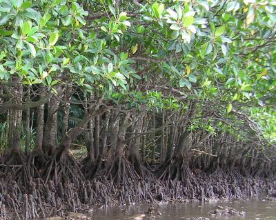 マングローブとはある植物の固有名称ではなく、熱帯や亜熱帯の河口汽水域で生育する植物の総称で、日本では沖縄県と鹿児島県に自然分布しています。西表島では、マングローブは仲間川や浦内川の流域で沢山見ることが出来ます。中でも、仲間川は甲子園球場が300個あまりも入るマングローブ林がよく発達しておりマングローブ林の面積としては我が国最大です。