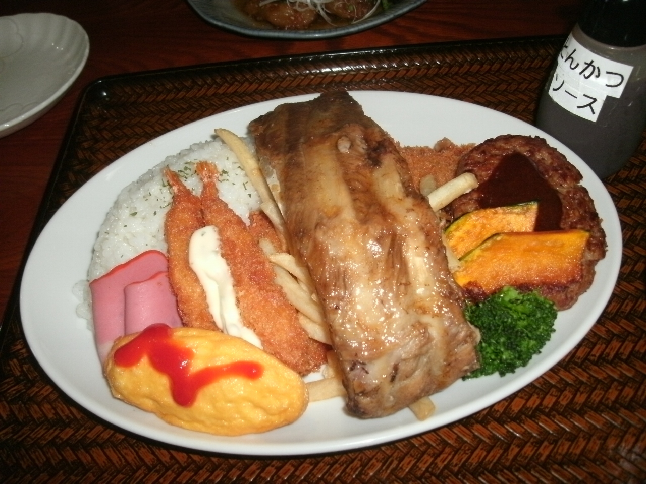 あまりのボリュームに驚き、ご飯だけ残してすべてを頂きました。スペアリブは美味しかったが、ハンバーグは肉汁が出るようなものではなかったし、豚カツも付いて来たソースがもう一つで残念なものでした。全体的な評価としては、ボリュームにびっくりして、内容そのものは、沖縄で言うところのごく普通の“Aランチ ”というものでした。