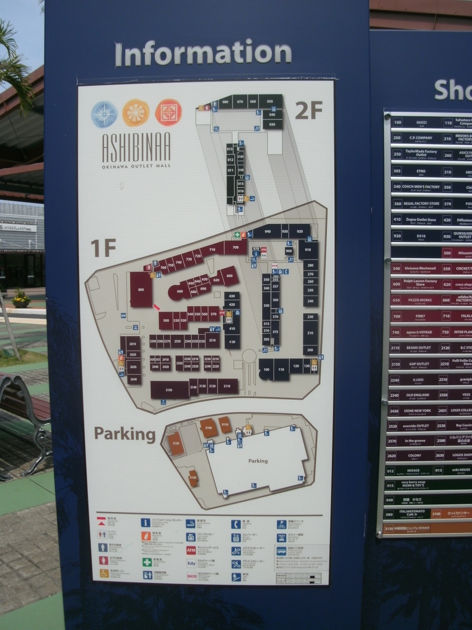 那覇から車で20分ぐらい、那覇空港や那覇バスターミナルからシャトルバスも出ています。駐車場は広くて無料です。広いモール内には、ブランド店が数多く並びます。近隣には、道の駅やJAおきなわ食菜館菜々色畑、ヤマダ電機、レストランなど多数あるので、ショップ好きな方は一日中楽しめます。