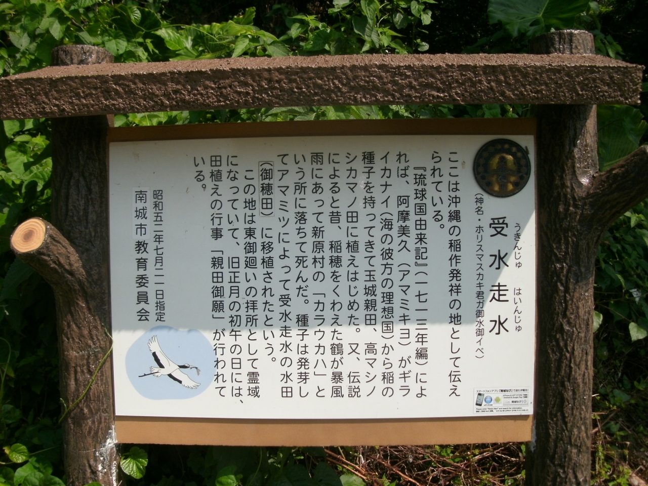 受水に面して御穂田(ミフーダ)とよばれる小さな田んぼがあり、琉球における稲作発祥の地と伝えられています。