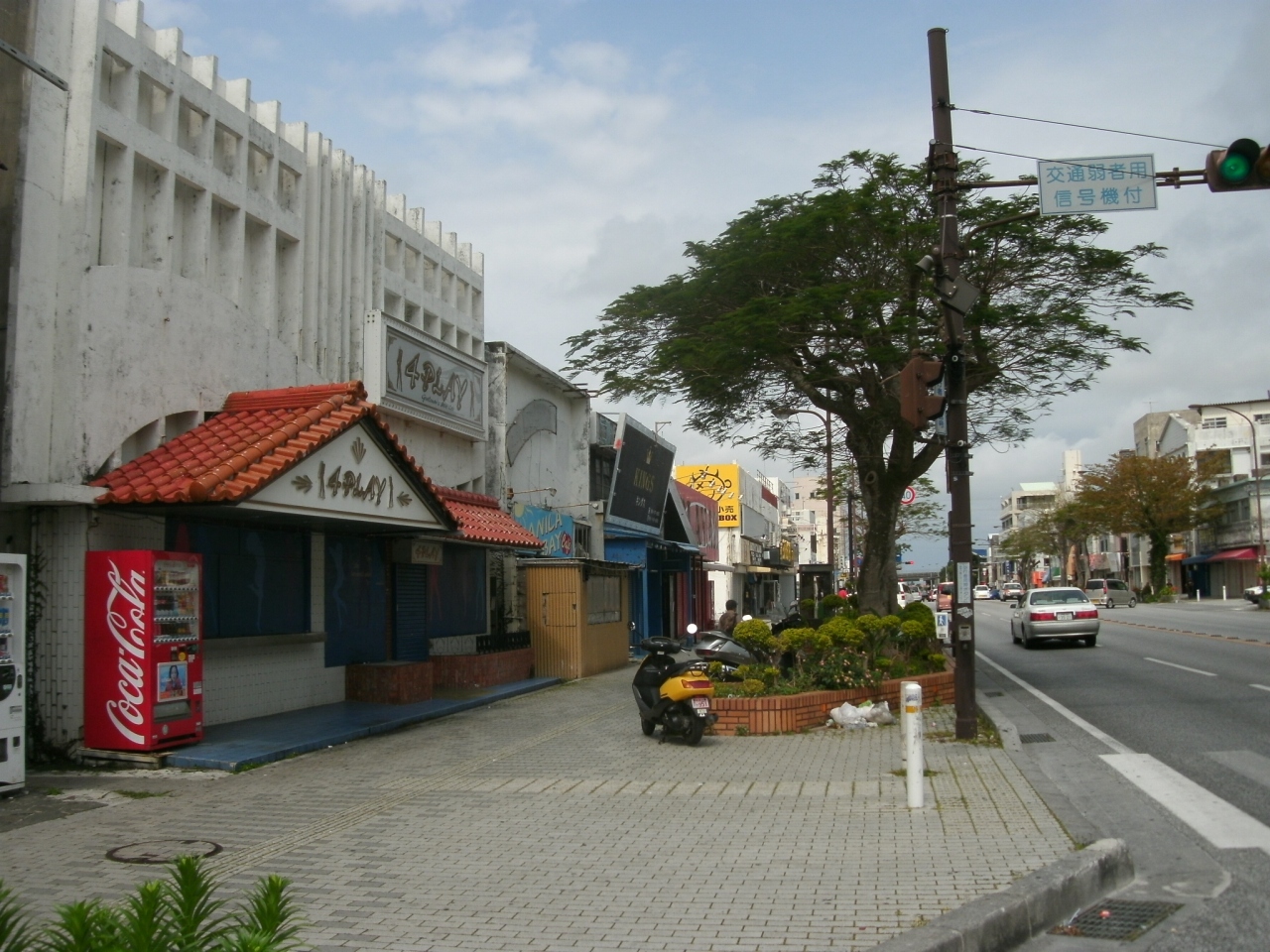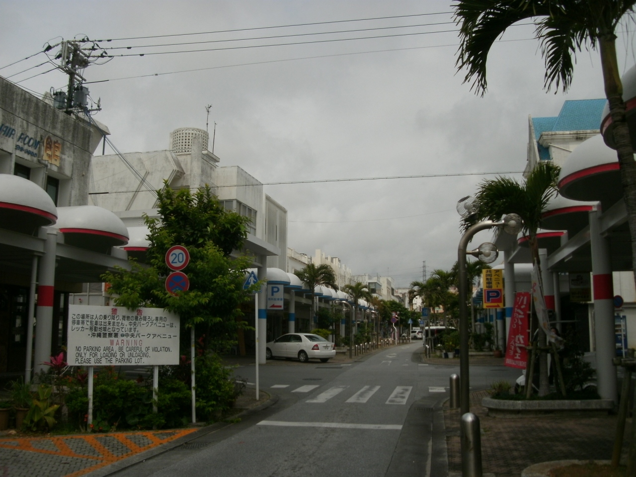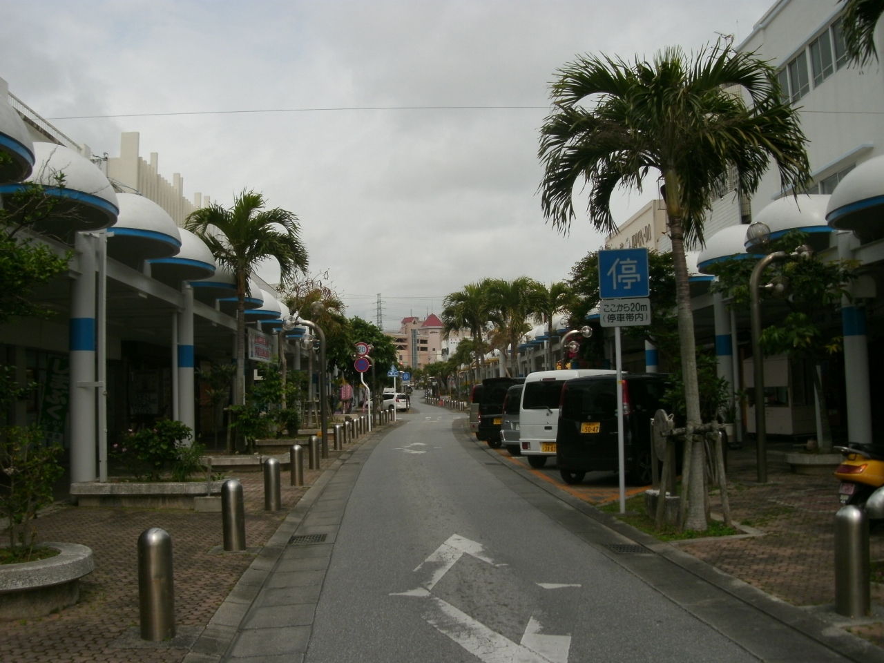 国道330号線からの一方通行路となっており、車一台分の車道の両側には、面白い形のアーケードを持った広い歩道が設けられています。500mほどの通りには、マニラヤシやガジュマル、ブーゲンビリア、ハイビスカスなどの植物が植えられ、飲食店や雑貨屋、時計店などが並んでいますが、閉まったままのお店も多かったです。昔は米兵相手の歓楽街として賑わっていたそうですが、訪れたのが平日のお昼頃だったせいか人通りも少なく寂しい感じがしました。夜は賑やかになるのでしょうか?