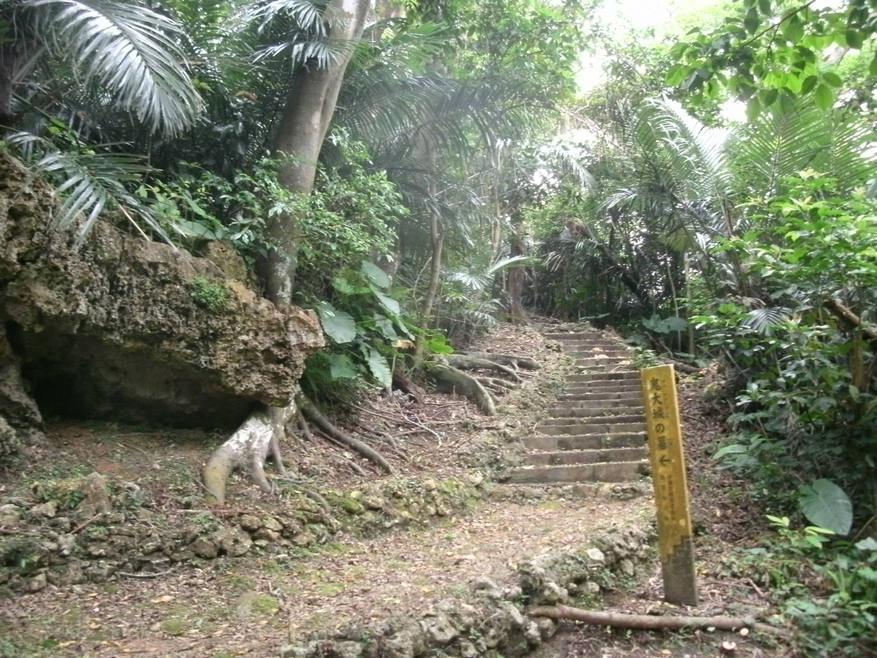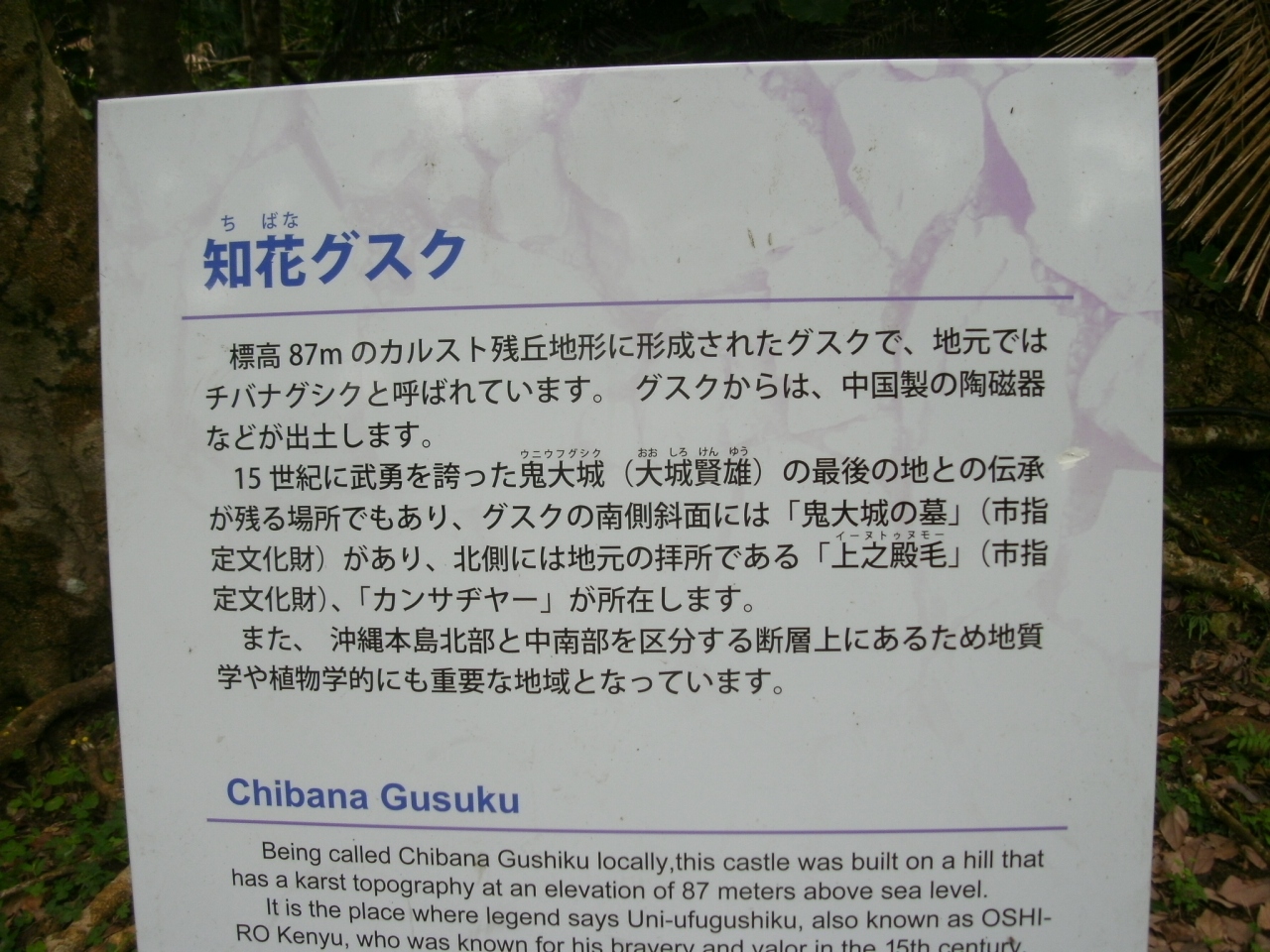 沖縄北ICから車で5分足らず、国道329号線の知花の交差点からすぐのところにあります。標高100mほどの台地に造られたお城跡で、地元ではチバナグシクと呼ばれています。15世紀に武勇を誇ったと言う鬼大城(大城賢雄)最期の地と伝承されていて、お城の南面にはお墓もあります。ただ、城跡と言っても、きちっとした城壁などはのこっておらず、見るべきものはあまりありません。自然タップリなところで、散策にはいいかも。