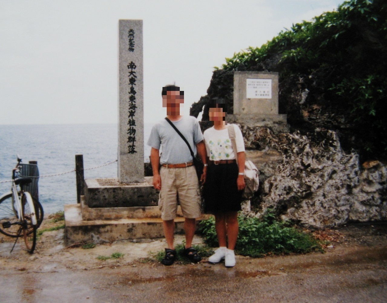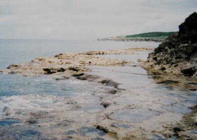 南大東島の東海岸の“海軍棒”と呼ばれる岩礁地の近くに「南大東島東海岸植物群落」の石碑が立っています。付近一帯は、ミズガンピを主としたオオソナレムグラ、ボロジノニシキソウ、ウスジロイソマツ等の混生した群落地で、その中でもボロジノニシキソウの群落は南北大東以外にマリアナ諸島・オーストラリア等の極限られた地域でしか見ることのできない、学術上貴重な群落だそうです。植物には詳しくないし、植物の種類ごとに説明・表示板などが無いので、正直、良く判りませんでした。しかし、緑豊かな海岸線はとても綺麗です。