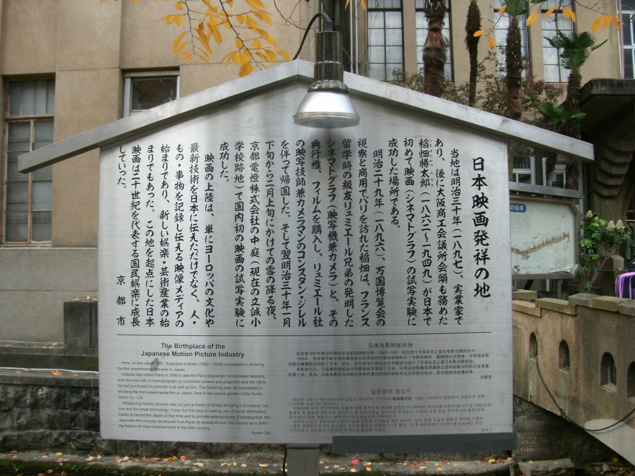 1896年(明治29年)、実業家の稲畑勝太郎が商用で渡欧した際に、フランス留学時の級友であるリュミエール兄弟が発明した“シネマトグラフ(映写機兼カメラ)”と版権、フイルムを購入して、リュミエール社の技師と共に帰国し、翌年の1897年(明治30年)1月から2月にかけてこの地 京都電燈会社の中庭(現在の立誠小学校跡地)で日本初の映画の試写実験に成功したところです。