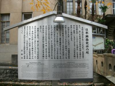 阪急河原町駅から木屋町通りを北に約200m、高瀬川に面する元・立誠小学校玄関前の歩道上に「日本映画発祥の地」と書かれた碑が立っています。
