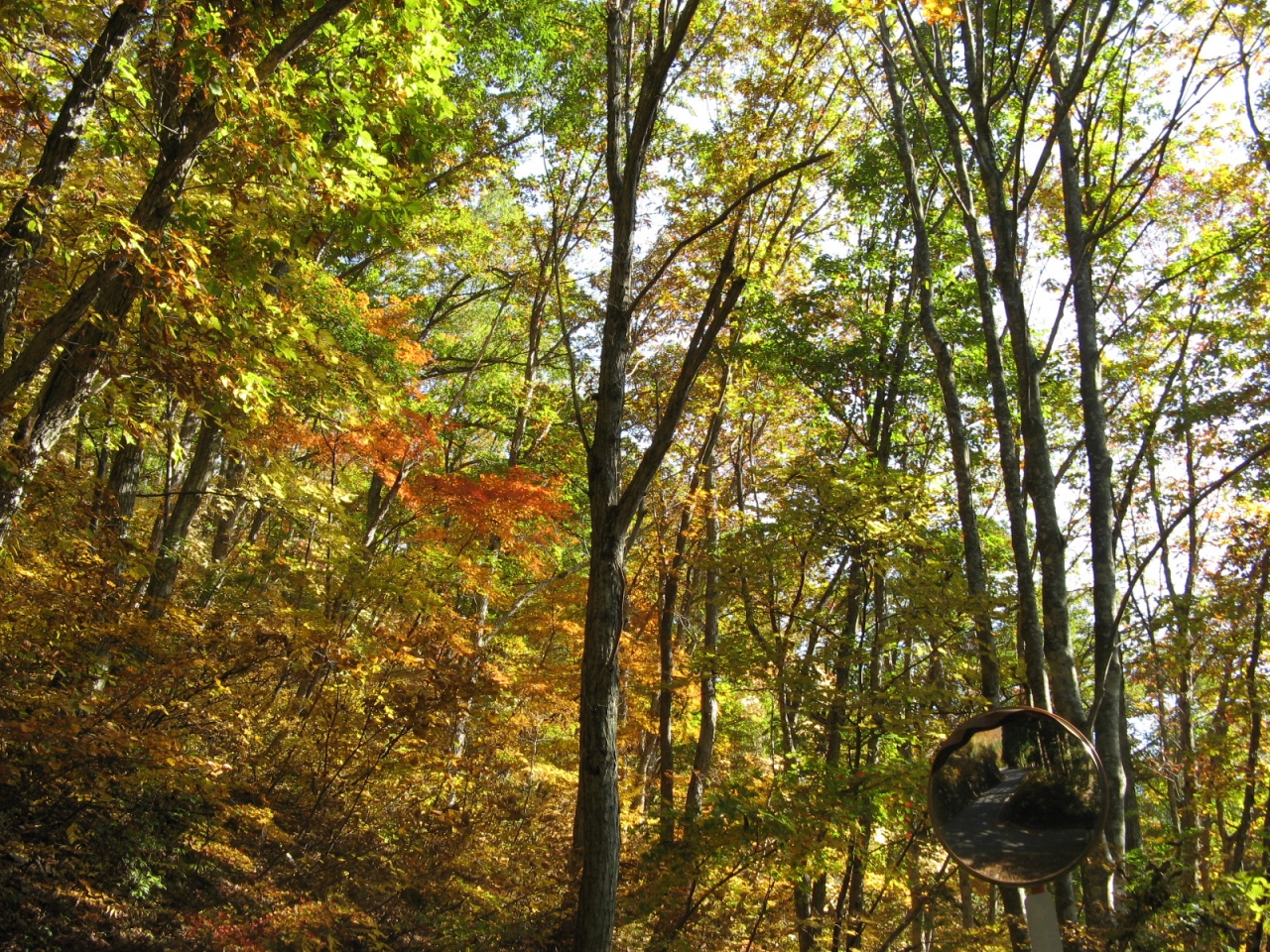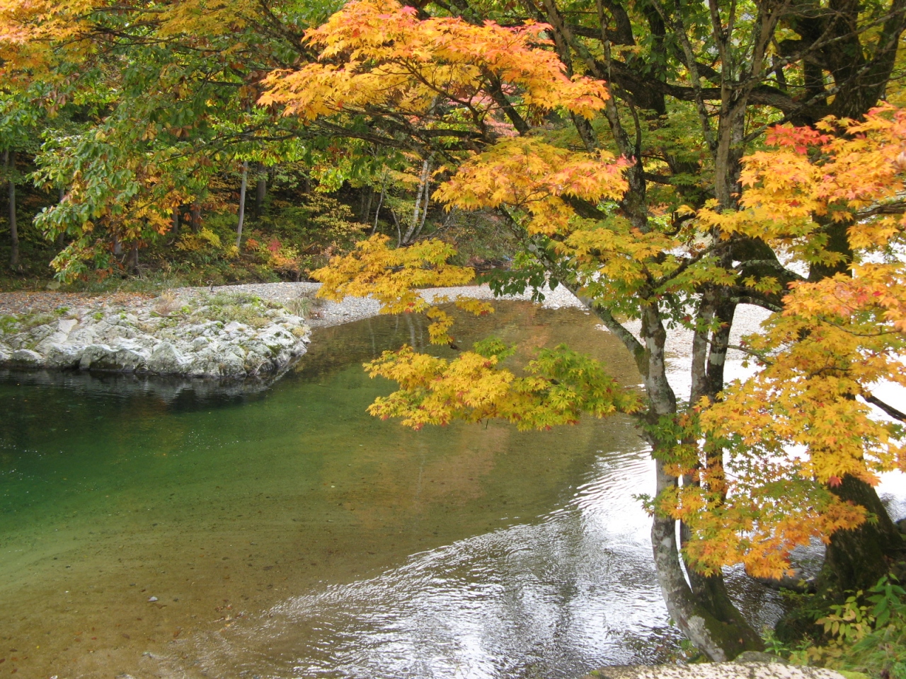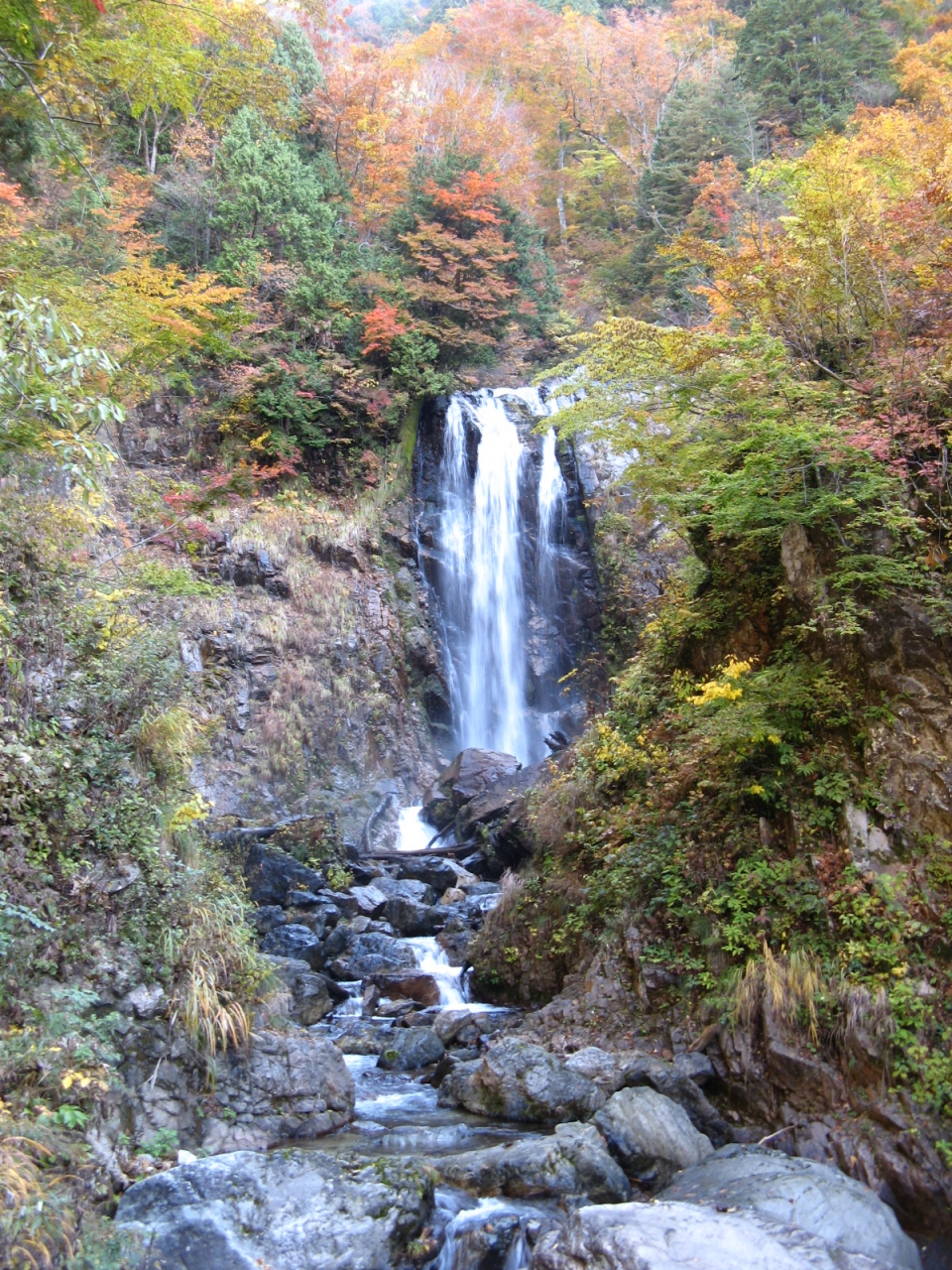白川郷ICから国道360号を車で走って約20分、白川村中心部から天生峠へ向かう途中、木滝谷にある滝です。下流から“木滝”、“中滝”、“高滝”の3つの滝があり、これら三滝で“天生三滝”と呼ばれています。“木滝”は国道からは見えませんが、国道から少し入って川沿いに上流へ少し歩けば、落差10m程の滝を見ることが出来ます。“木滝”から国道を天生峠の方へ1kmほど行くと落差20m位の迫力のある“中滝”が突然現れます。そこから更に国道を1kmほど進むと落差50mと言われる“高滝”を遠望することが出来ます。10月末に訪れましたが、滝の周りの紅葉が素晴らしかったです。