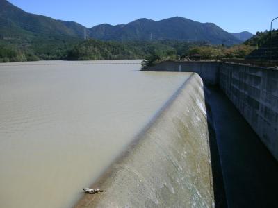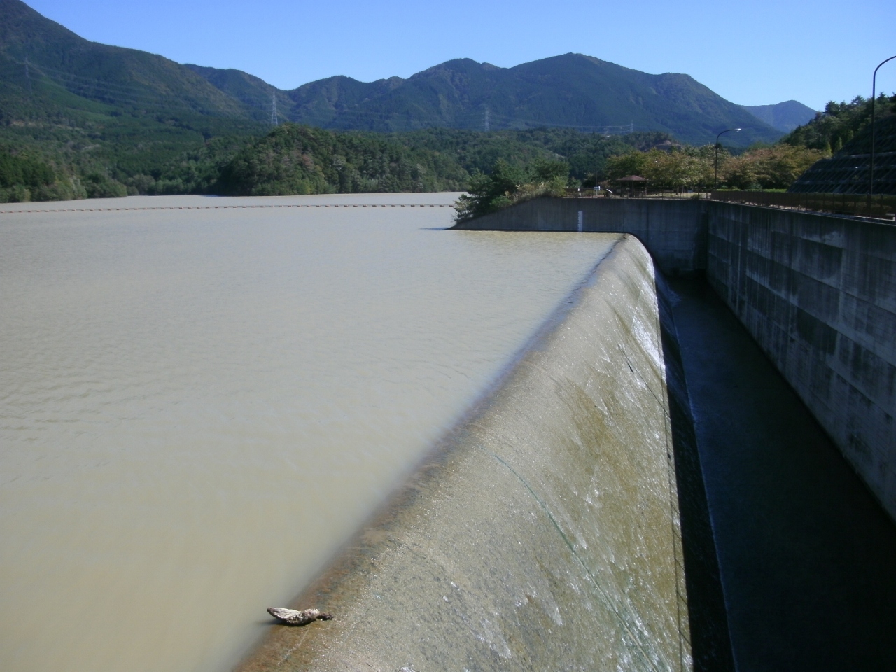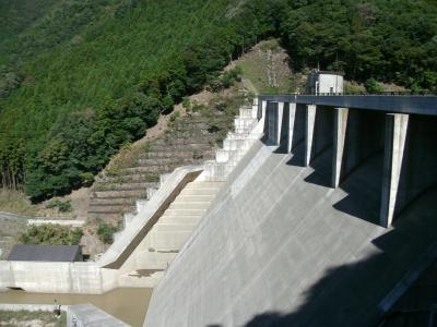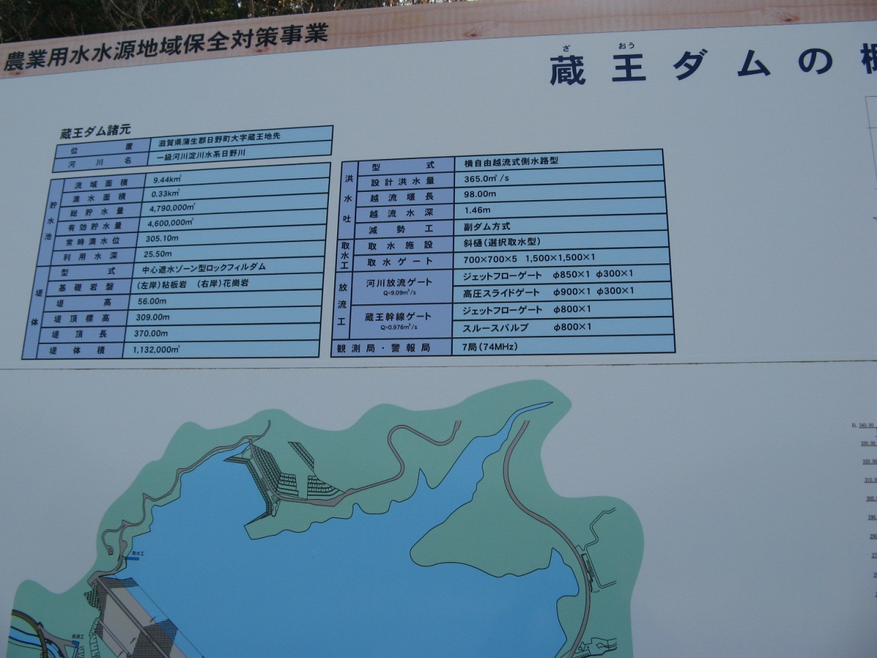 「蔵王ダム」は、一級河川・淀川水系日野川を堰き止めて造られた、農業用水用のロックフィル式ダムです。ダムの下は東屋を備えた公園のように整備されています。ダムの周辺の天端に向かう歩道にはベンチが設置されダムを見ながら休憩することが出来ます。管理所までいく道の脇に広がる洪水吐はダム湖を切り取ったようで面白い。管理事務所にお願いして、ダムカードを頂きました。