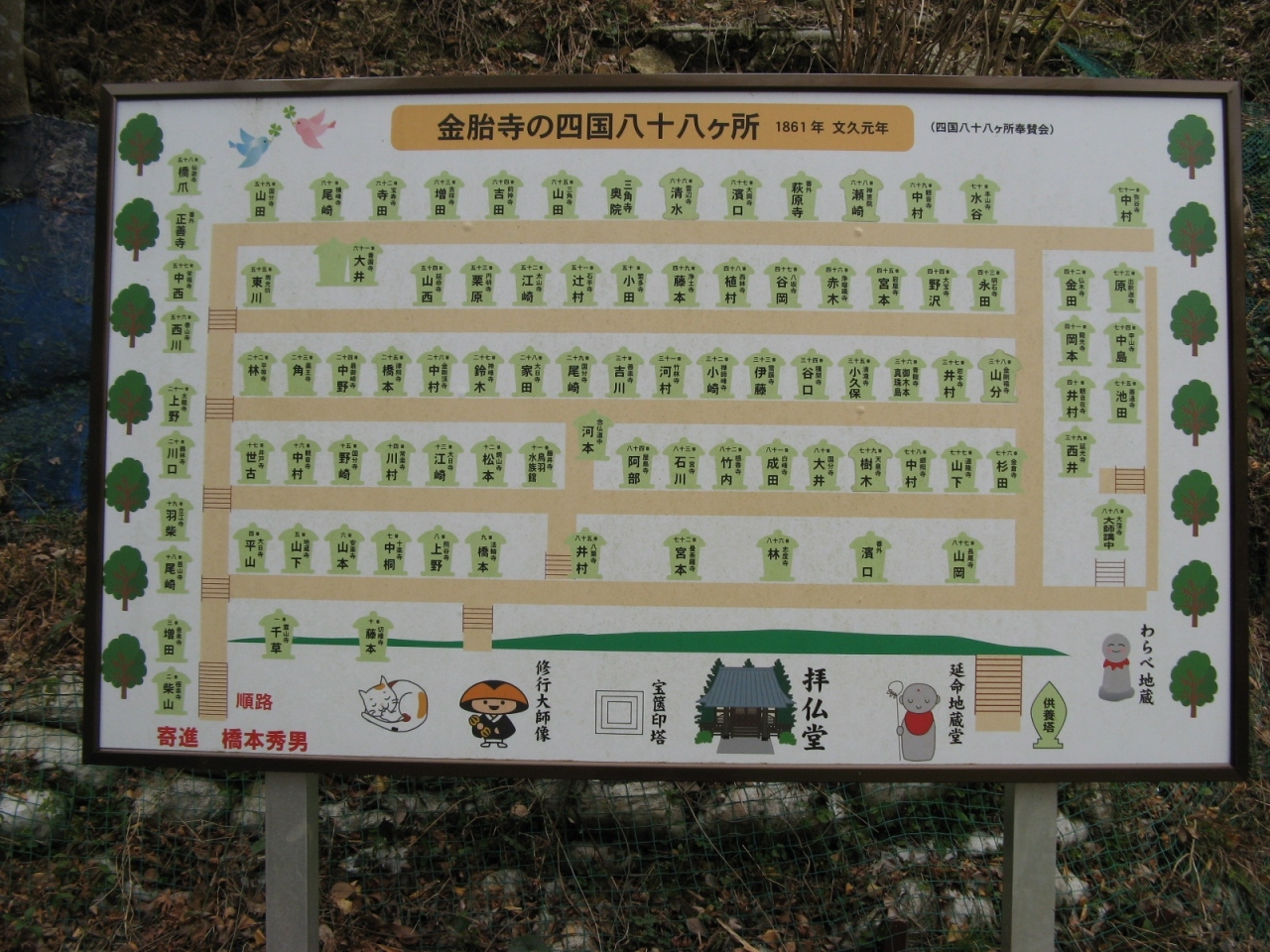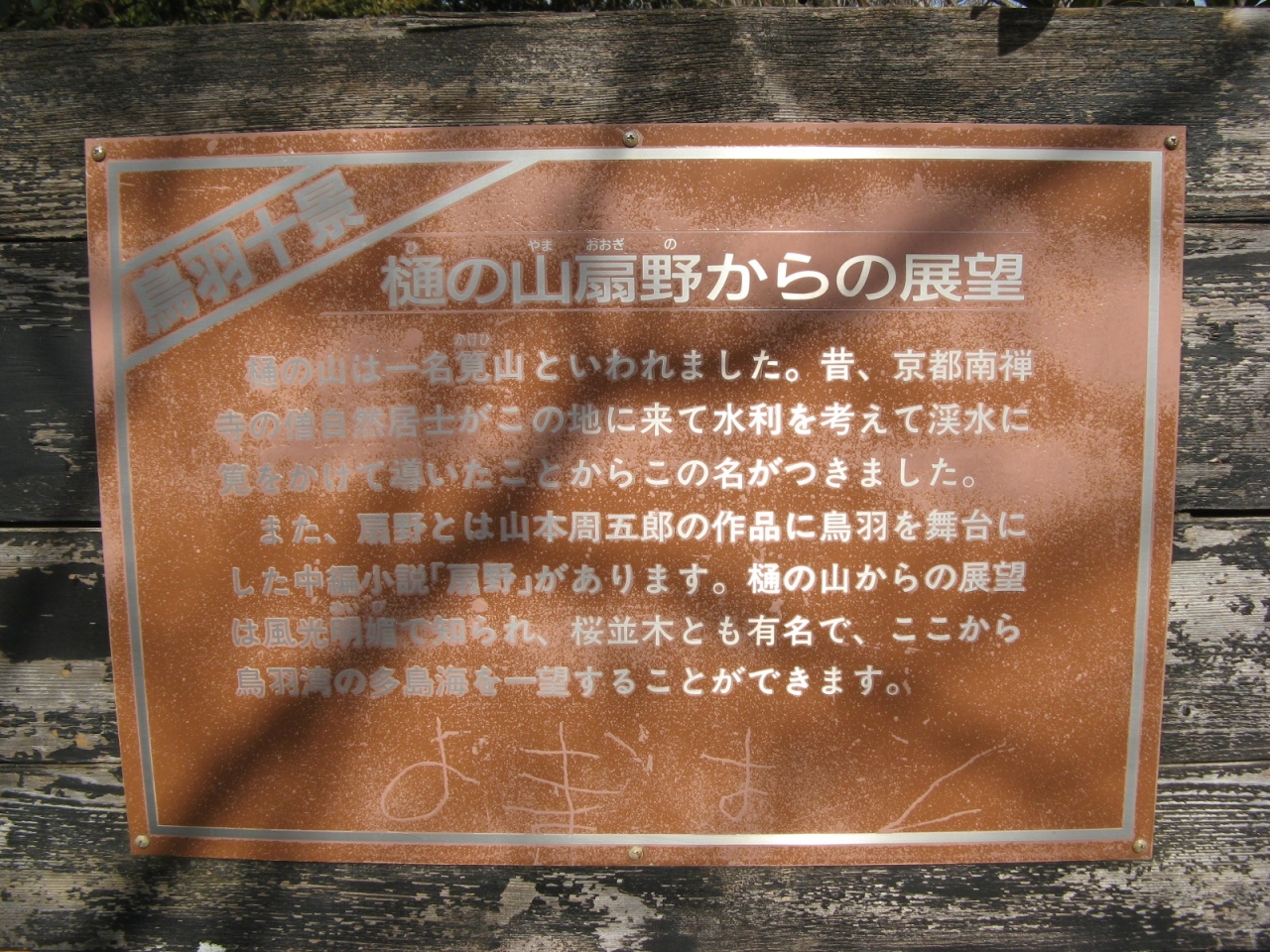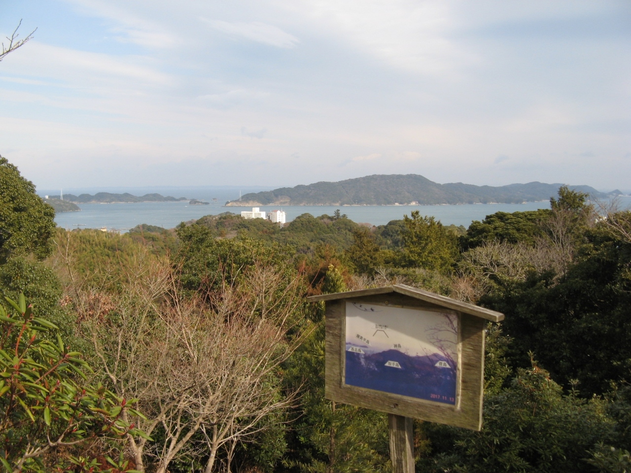 近鉄鳥羽駅から歩いて40分ほど、鳥羽三山の一つである樋の山の一角にありちょっとしたハイキングでした。境内に駐車場があるので車で参拝することもできます。金刀比羅宮鳥羽分社は、昭和31年に全国に六社ある直轄分社の一つとして金刀比羅宮御本宮より御分霊を迎えて建立されたものだそうで、本殿前の階段の下、鳥居横に「讃岐 金刀比羅宮鳥羽分社」と刻された社標が建っています。昭和の創建ということや本殿がコンクリート造りなどで歴史的な雰囲気を感じることはありませんでしたが、樋の山公園の一隅にあり、鳥羽湾を一望することができました。