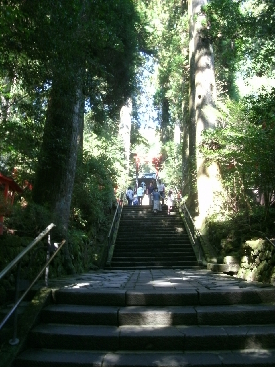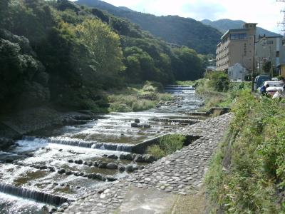 「早川」は、芦ノ湖北端の湖尻より流下する二級河川で、箱根湯本あたりで須雲川と合流して、相模湾にそそいでいます。須雲川と合流する湯本付近の峡谷がもっとも急峻で、箱根登山鉄道湯本駅は早川の渓谷の傍にあり、駅前の道路は渓谷に沿って続いています。駅前から道路を渡ると、すぐ早川にかかる橋の上に出ます。階段のようになった川床の岸辺には温泉旅館が並んでいます。