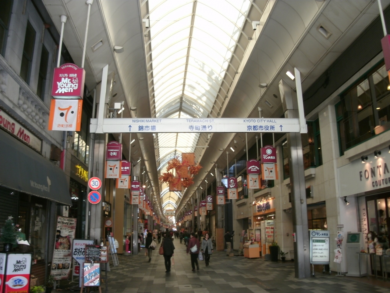 紫明通から五条通まで南北に通る道ですが、その一部である、市役所の前の御池通から五条通までの間が観光客によく知られています。御池通りから三条通りまでの間は老舗のお店や、骨董店、古書店、画廊、カフェなどのお店が多く、寺町通ならではの風情が楽しめます。三条通から四条通りの間は、フアッションや雑貨のお店が多く、市場から南は電気店やパソコンシヨップなどが目立ちます。四条通より北側はアーケードがあるので雨に濡れないし、すぐ隣には土産物店が多い新京極通りもあるので、目的に合わせて散策するのが良いと思います。