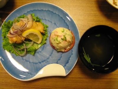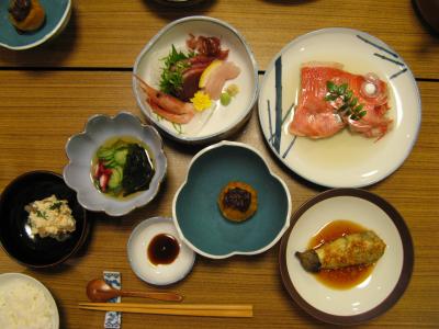食事は、お刺身4種(イカ、マグロ、エビなど)に金目鯛(四分の1)の煮付け、白和え、茄子の煮付け、鶏のカレー風味焼きなどで、宿泊費から見てそこそこ。