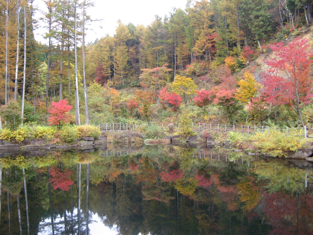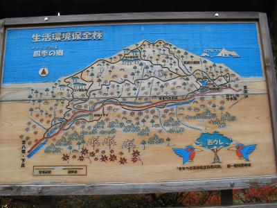 「せせらぎ街道 四季の郷」は、東海北陸自動車道の“郡上八幡IC”から国道472号線を車で30分ほど走ったところにあります。西ウレ峠分水嶺の近くの道端に「四季の郷」の石碑が立っています。付近は森林公園として整備され、いくつかの遊歩道コースがあり、“鏡池”や“大倉滝”の景観を楽しむことが出来ます。10月の下旬に行きましたが、紅葉した山林を映し出す“鏡池”は素晴らしかったです。