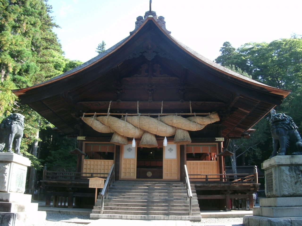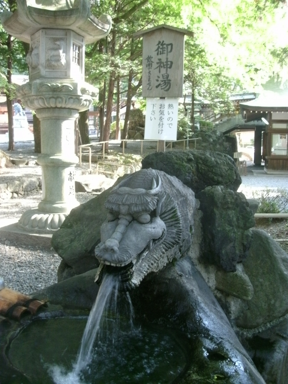 「諏訪大社下社秋宮」は、JR下諏訪駅から歩いて10分ほどのところにあります。旧中山道と甲州街道の合流点近くにあり、交通の便が良いので諏訪大社四つの宮の中で参拝者が多いと言われています。温泉地らしく、手水場で龍の口から温泉が出ているのにはビックリしました。参道を進むと正面に神楽殿、その奥に幣拝殿があります。神楽殿には重さ1トン以上もあると言う大注連縄がかかっており、日本一大きい青銅の狛犬があります。社殿を取り囲むように御柱が手前側に2本、奥に2本置かれています。境内は思ったより広くなかったですが、凛とした雰囲気の中、立派な社殿や御柱などを見て感動しました。