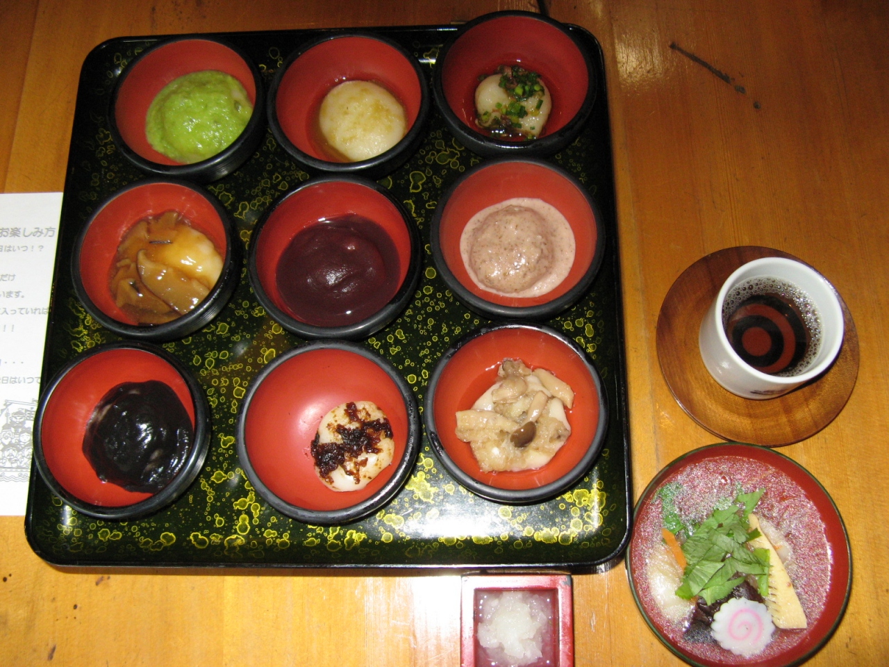 家内と二人、“果報餅善 2100円”注文、待つことしばし、出てきたお料理は、お餅が小さな器に入ったものに、お雑煮がセット、そのボリュームと綺麗さにビックリ。お餅は、餡子、ズンダ、胡桃、黒胡麻、大根おろし、え胡麻など9種類。ちよっとボリューミーかなと思いましたが、一つ一つ味が違うので、最後まで美味しく頂くことができました。