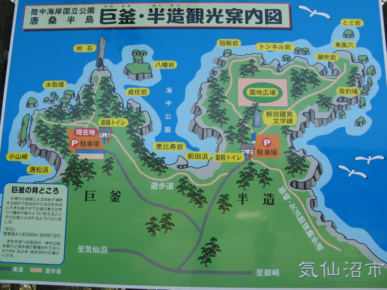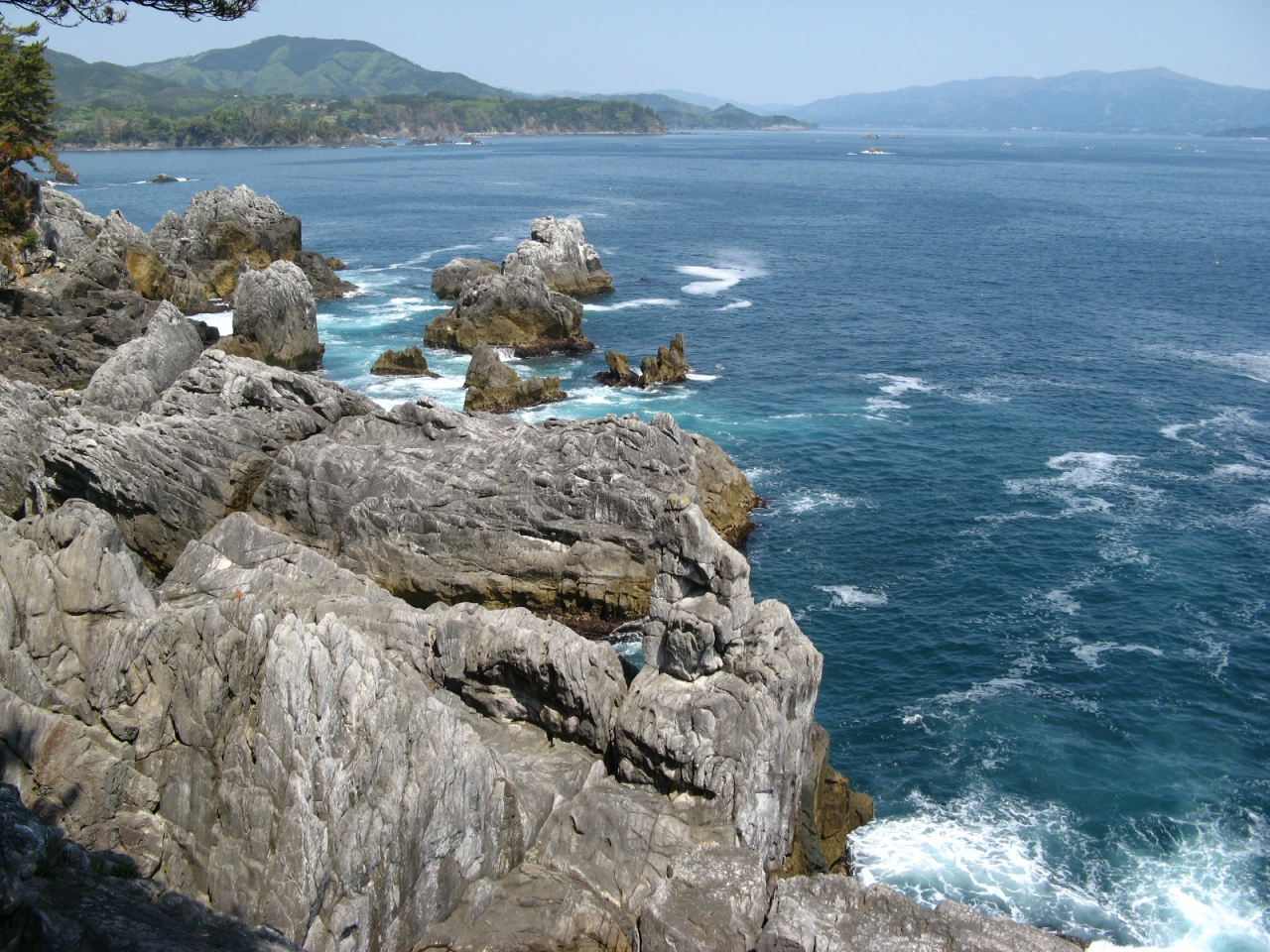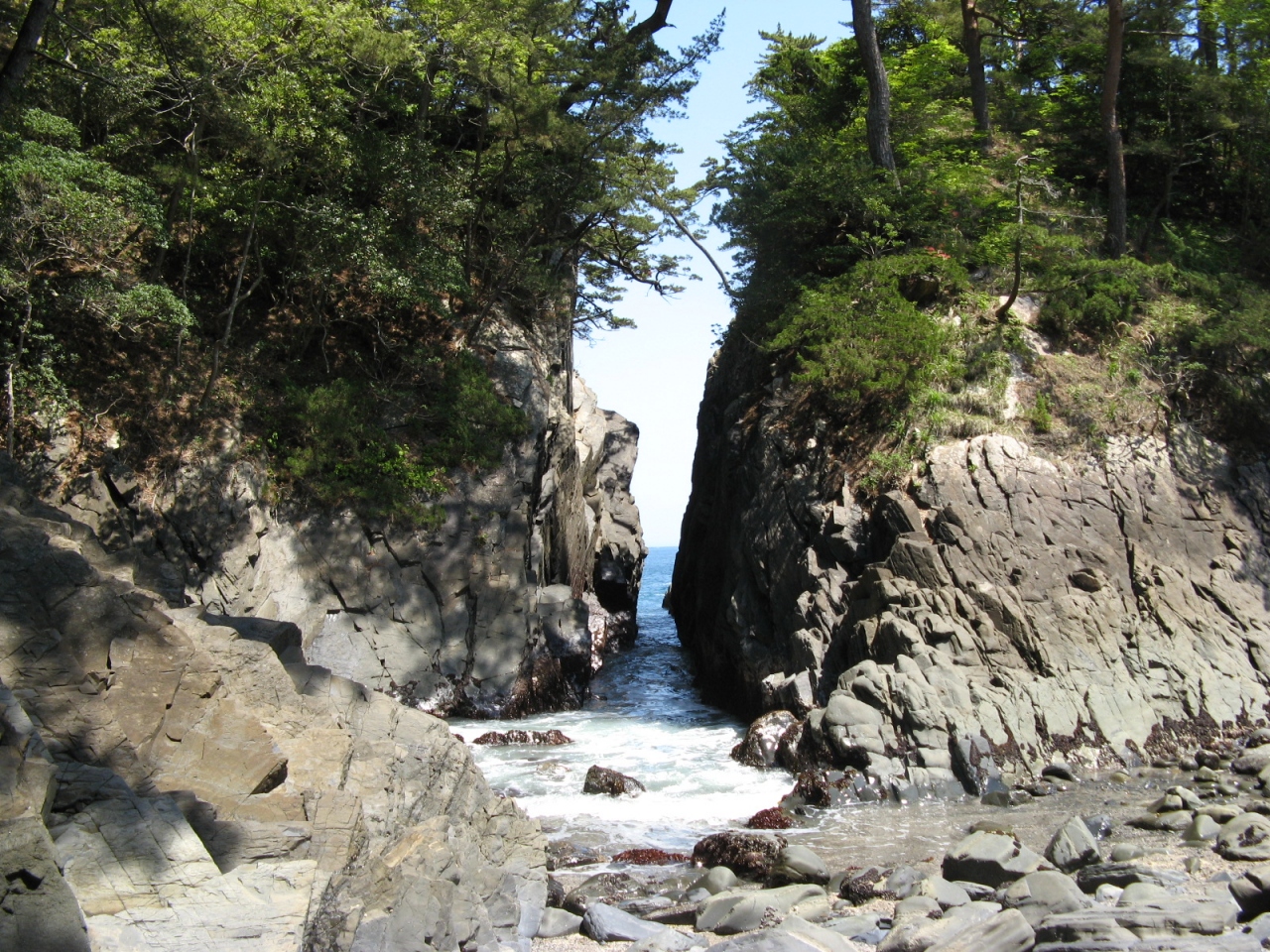 南三陸金華山国定公園は、宮城県東北部太平洋岸に面し、リアス式海岸が総延長180kmにわたって伸びる地域です。北から志津川町、追波、女川などの湾が深く切れ込むとともに、歌津崎、神割崎、寄磯崎などの岬や、太平洋に突き出た牡鹿半島、金華山島、江ノ島などの島々で、大規模な海食崖を形成しています。金華山はこの公園最大のハイライトで、黄金山神社が鎮座した聖域でもある為、社の周りには天然のブナ林、モミ林が残されています。またニホンジカを神鹿として扱った歴史があり、野生の鹿も見られます。