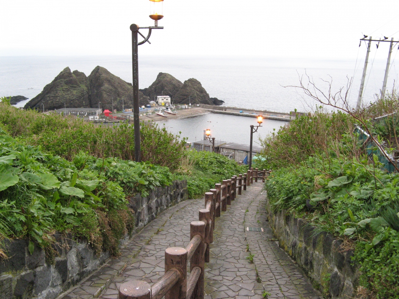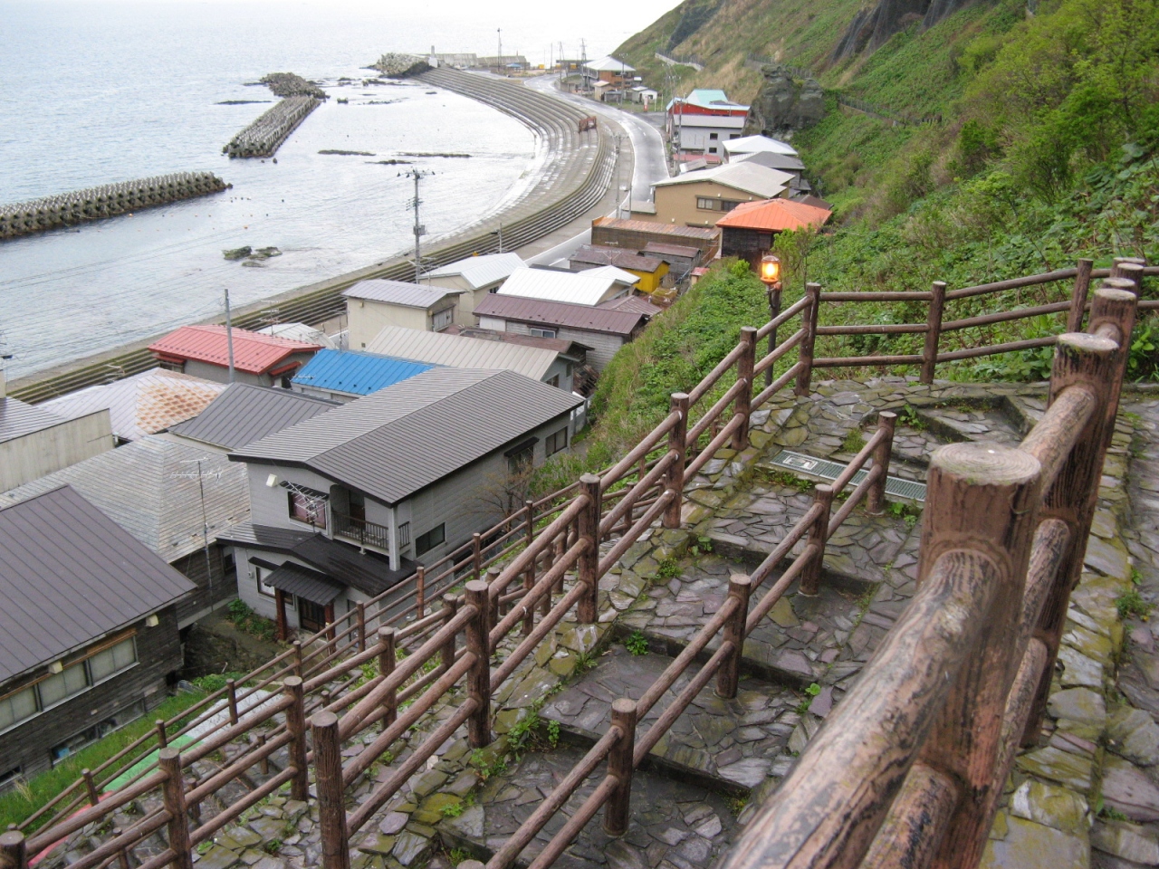 竜飛岬のすぐ近くにあります。竜飛崎のバス停から灯台方面に登らず、港の方に下る200mほどの道が階段国道です。