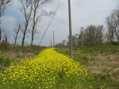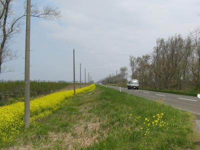 5月はじめに訪れましたが、広大な干拓地を一直線に走る道路際に綺麗に菜の花が咲いていました。