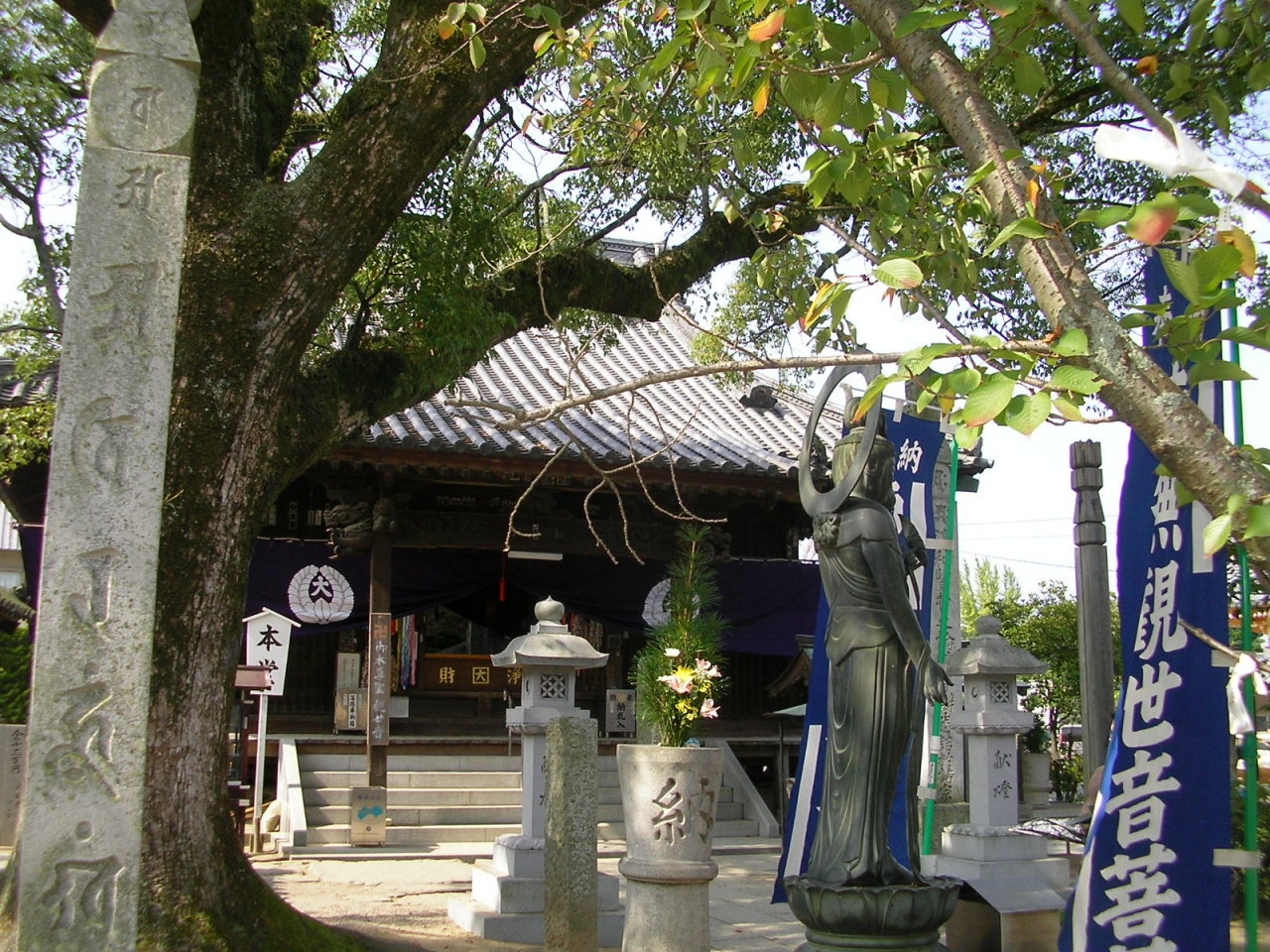 街中にあるお寺さんで、道路に面した仁王門前には4mもある大きなワラジがぶら下がっています。仁王門をくぐり参道正面に本堂、右手に大師堂、左手に納経所があります。境内の南側には根回り6mもある大きな楠木があります。この楠木にはお遍路さんの道中安全やお寺のお守りをしたという伝説が伝わっており、お遍路さんからも親しまれているそうです。