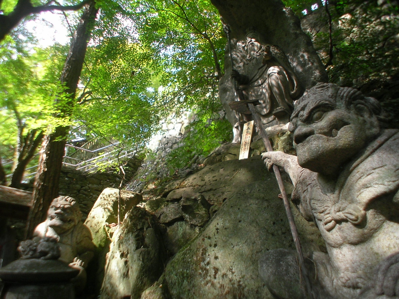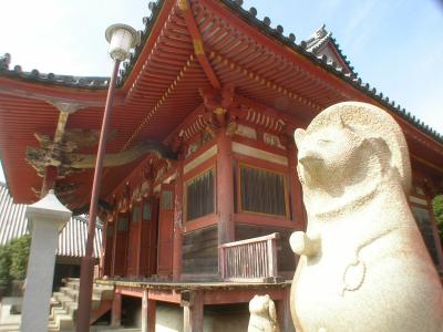 山門をくぐり阿波藩蜂須賀公寄進の四天門をくぐると境内は広々として、正面に重要文化財に指定されている朱色が鮮かな本堂があります。本堂の横には、数珠を手にした大きなタヌキの“蓑山大明神”があります。そのほか、大師堂や四天門、三体堂、千体堂、鐘楼堂など沢山の建物があり、見所の多いお寺さんです。