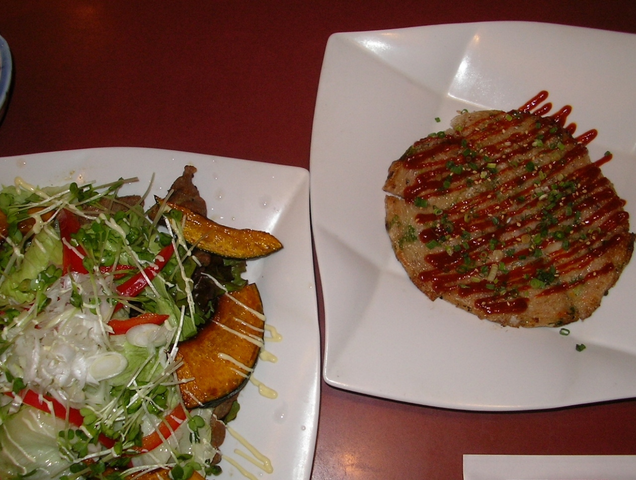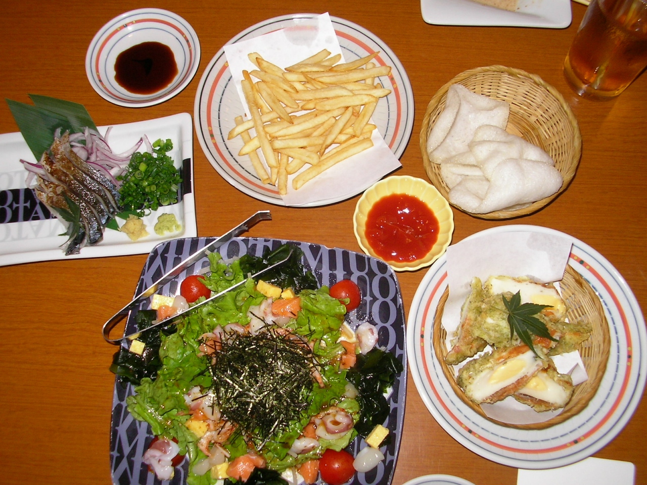 店内は広く綺麗です。半個室の様なところの席に案内されました。家内と二人で、アラカルトからオーダー。蒸鶏サラダ、海鮮サラダ、しめ鯖造り、豆腐天麩羅、磯部揚げ、明太子ピザ、もちもち焼きなどを頂き、おなか一杯食べて飲んで5000円足らずでした。