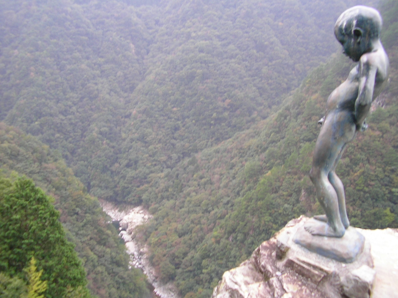 昔、子供達が度胸試しにここで小便をしたとの逸話から造られたとのこと。深さ200mもあろうかという、断崖の上にせり出した岩の上の小便小僧はとてもユーモアあるものでした。付近は道路も狭くカーブも多くて、駐車場もないので注意が必要です。- 旅行時期
