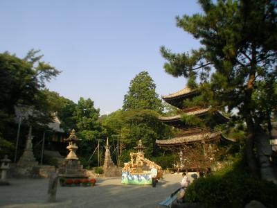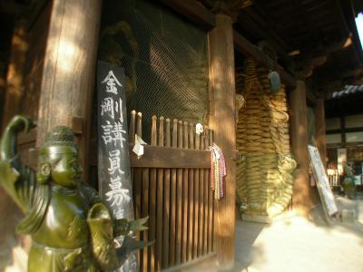 参道をしばらく進むと仁王門があり、大きなわらじがつるしてあります。このわらじは、足の悪い人が大わらじに触わり、その手で自分の悪い部分に触ると治ると言われています。門をくぐると右手に美しい三重塔がそびえ、それと並んで鐘楼が建っています。正面一段高いところに本堂があり並んで大師堂が建っています。