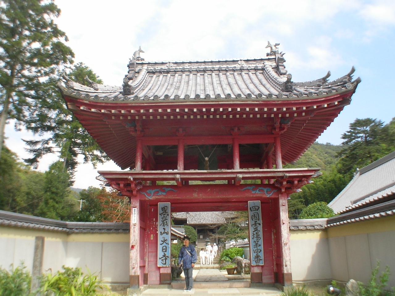 四国八十八ヵ所霊場の第4番札所です。3番札所の金泉寺より約7kmの人里はなれた渓流にのぞみ、森の木々に囲まれた閑静な自然にあります。弘法大師四国巡錫の砌り開基と伝えられ、本尊大日如来は一寸八分(5.5cm)の秘仏で、大師の刻まれたものといわれ大日寺と号しています。鐘楼門は朱塗りの山門で、上部が円柱の鐘楼となっており、1階は角柱という珍しい造りです。本堂と大師堂をつないでいる回廊に、木造観音像が安置されています。色んな形の観音様がおられますので参拝して下さい。