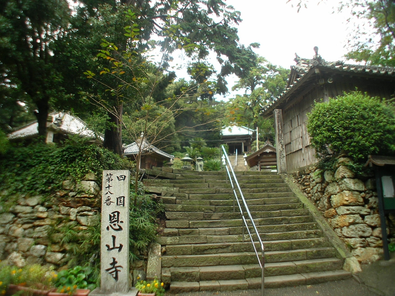 四国八十八ヶ所霊場の第十八番札所です。JR南小松島駅から西へ進み、日開野町交差点で左折して国道55号線を南へ進むと案内板が出ています。行基が開基し、本尊は薬師如来。 山門をくぐって坂道の参道を登って行くと駐車場があり、右手の石段を上ると境内に入り、直進すると右手に手水場があり、石段を上り詰めた所に本堂が建っています。大師堂の手前には、「大師御母公剃髪所」の石碑と小さなお堂が建ち、大師作と伝えられる「御母公像」、母君の髪の毛が安置されています。