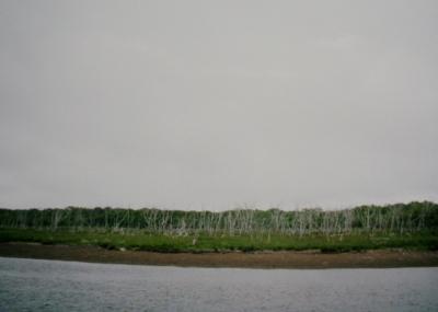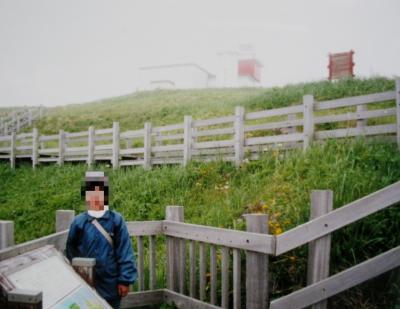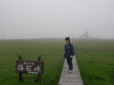 「落石岬灯台」は、根室市街から、道道142号線と1123線を通って、車で1時間あまり、太平洋に突き出た落石岬にある灯台です。塔型(四角形)のコンクリート造りで、白地に赤横帯が1本入った、独特の外観をし、1998年に「日本の灯台50選」に選定されています。灯台に行くには、車道終点から林や原野の中を歩いて20分ほどでかかります。途中の湿地帯では1メートルほどの高さのある狭くて高い木道を通ります。観光地化されておらず、売店はもちろんトイレもありません。すれ違う人も無く、女性だけではとても恐ろしくて行くことが出来ないようなところです。残念ながら訪れたときは、霧がかかって、灯台は霧の中に霞んでいました。