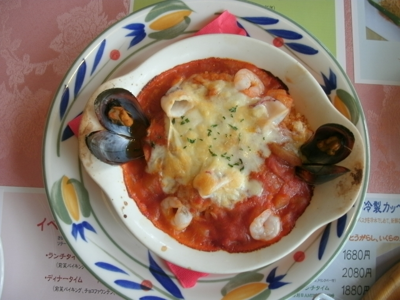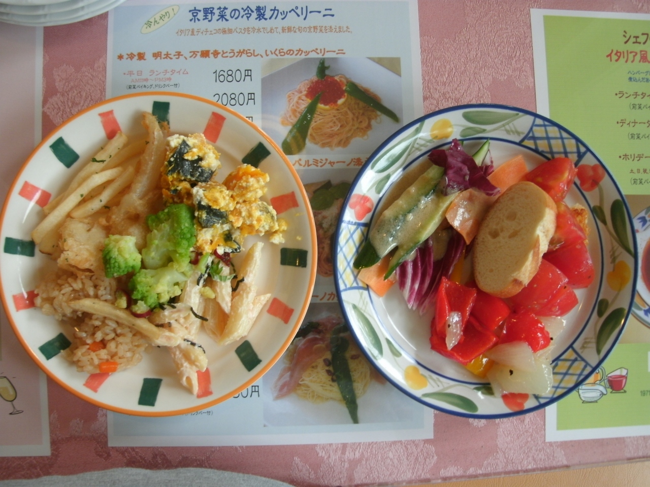 久しぶりに平日のランチ行きました。12時前なのにお店は満員状態、ほとんどが女性で人気があるようです。家内と二人、“地中海ドリア1280円”と“マルゲリータピザ1480円”を注文。全メニューに前菜バイキングとドリンクバーがついています。前菜バイキングはかぼちゃとナッツのサラダや、バーニャカウダ、ペンネ、フルーツ、クリームスープなど約10種類もあったのでランチとしては十分でした。