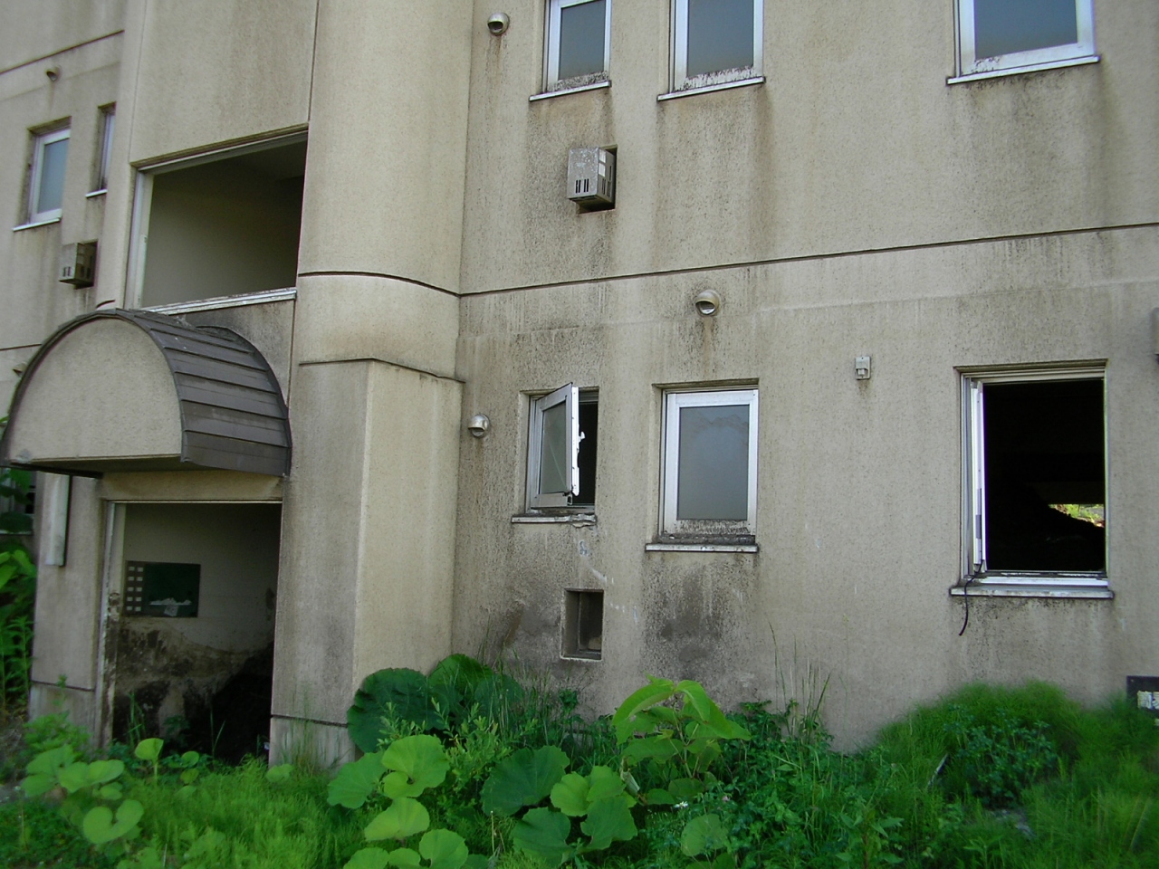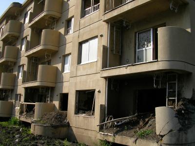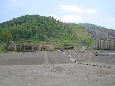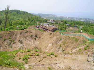 金比羅火口災害遺構散策路は洞爺湖ビジターセンター・火山科学館の山側にあります。平成12年(2000年)3月31日、有珠山西部山麓の西山付近で突如噴火し、翌日には金比羅山中腹でも噴火。この噴火口群から発生した大量の火山灰と噴石、熱泥流によって埋め尽くされた桜ヶ丘団地と町営温泉「やすらぎの家」を噴火の遺構物として保存し、火山噴火の災害を伝えていくために、整備されたものが金比羅火口災害遺構散策路です。5階建ての桜ヶ丘団地の1階部分が完全に埋まっている姿を見ると、火山の恐ろしさを体感する事ができます。