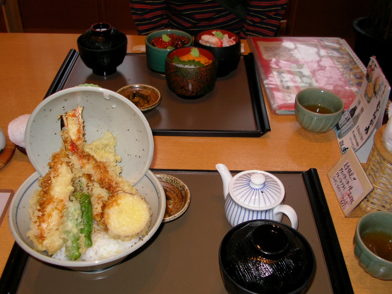 お店は、朝市の場所にあります。ウニの専門店ですが、家内のウニだけでなくいろんなものを食べたいということで、家内が“北海道三色丼 2205円”と私が“村上天丼 1890円”を頂きました。三色丼はウニ、イクラ、カニの小丼が1個づつで、家内の話では、どれも新鮮で美味しかったとのこと。天丼の方は、カニ、イカ、サカナ、野菜などで揚げ立てサクサクで美味かった。観光地だからか、それほどお得感はありませんが、新鮮な魚介を食べたいという観光客にはお奨めです。