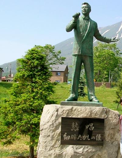 羊蹄山(蝦夷富士)の南の麓にある真狩村出身の細川たかしさんのデビュー20年と村への貢献を記念して、平成6年に建立されたもの。細川たかし像の土台部分に設置してある手形のセンサーに手を当てると、“北酒場”や“浪花節だよ人生は”など代表曲が流れます。