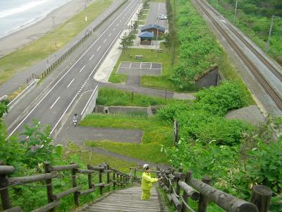 カムイチャシ史蹟公園は豊浦町の西、約8km、礼文華(れぶんげ)海岸の茶津岬にある公園です。道道608号線のカムイチャシトンネルを越えたところに駐車場があり、そこから道道608号線とJR室蘭線の間にある、130段ほどの木製階段を登って行くと、公園に出ます。公園名になっている「カムイチャシ」とはアイヌ語で「神の砦・館」を意味し、意味のとおり、雰囲気のある丘の上の公園です。園内には木道や東屋が整備され、室蘭本線や噴火湾、豊浦方面の海岸線や砂浜などを見渡すことができます。冬季は積雪のため休園となります。