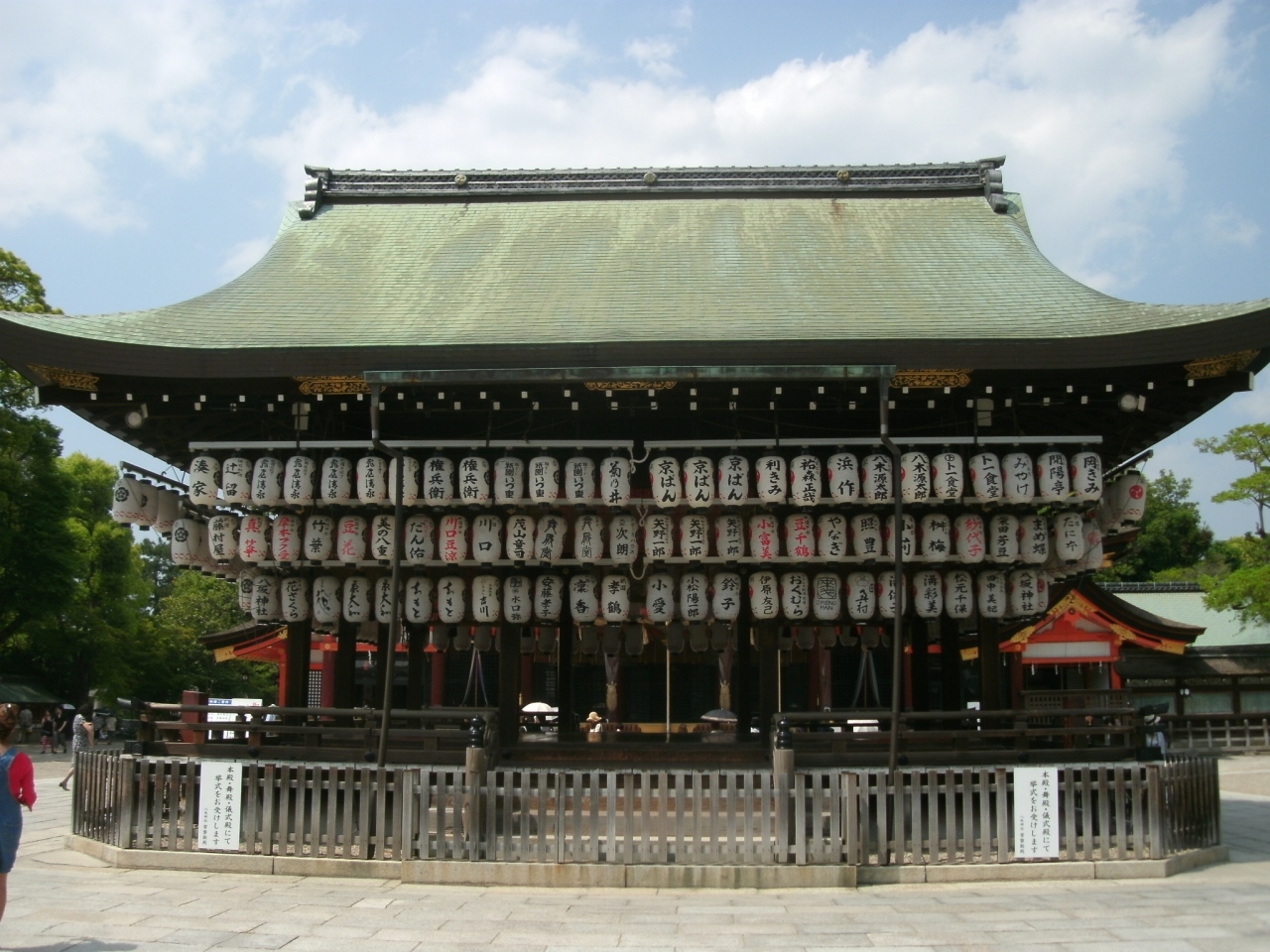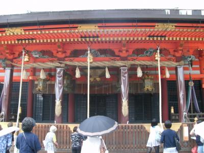「八坂神社」さんは、四条通の東のどんつきに鎮座されています。祭神は素戔嗚尊・櫛稲田姫命・八柱御子神で、明治維新まで祇園社または感神院と称しました。創祀は、諸説ありますが、社伝では斉明天皇2年(656年)と伝えられ、平安遷都がなされた延暦13年(794年)以前よりこの地に祀られていたとされています。また、貞観11年(869年)疫病流行の際、当社の神にお祈りして始まったのが祇園祭です。平安時代には二十二社の一に数えられ、朝廷からも厚く崇敬されました。一方、民衆の信仰も深く京都はもとより全国に広く崇敬されるようになり、現在ではこの神を祀る神社は全国に三千余社に及びます。