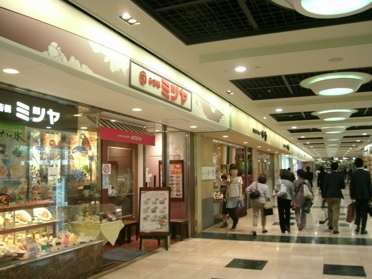 「心斎橋ミツヤ」さんは、ポルタの西通り、JR京都駅南北自由通路への角にあります。カフェと洋食のお店です。店内は広く、15時ごろ、買い物帰りに一服するために入店したのですが、お客さんでほぼいっぱいでした。メニューは、喫茶メニューの他に、ケーキ、パフェ、ワッフル、アイスなどスイーツも充実しているし、洋食メニューはハンバーグ、海老フライ、パスタ、グラタン、ドリア、カレー、オムライス、などが単品やセットで選べるなど大変豊富でした。家内が、抹茶ケーキとブレンドコーヒーの“ケーキセット700円”と私が“ブレンドコーヒー450円”を頂きました。コーヒーは深煎りで香りも強く、結構美味しかったです。11時以降は全面禁煙になっていました。