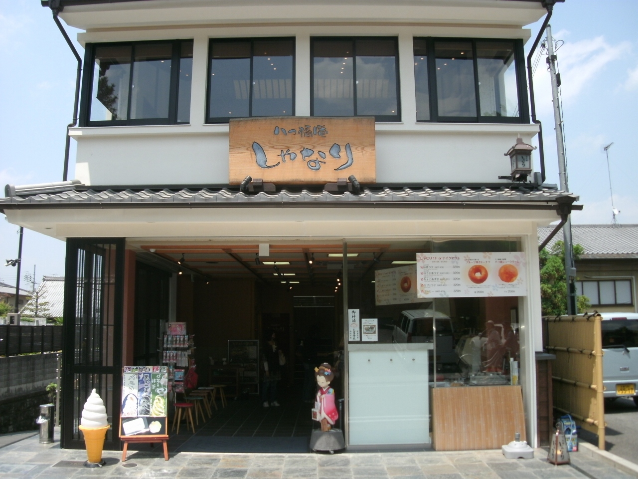 「八つ橋庵しゃなり」さんは、仁王門通(府道182号線)の南禅寺前交差点から南禅寺の参道へ進むとあります。平成23年に出来たカフェ&ランチのお店で、1階は京都のお土産とアイスやドーナツなどのティクアウトの店となっています。2階は南禅寺や東山などを望むカフェ&レストランになっています。南禅寺散策の際に、一服しました。ホットコーヒー320円と八つ橋シュークリーム250円を頂きました。八つ橋シュークリームはシュー生地の上に八つ橋を乗せて焼いたという感じで、サックリした生地と八つ橋のニッキと甘さ控えめでタップリのクリームが相まって美味しかった。南禅寺や疏水観光の際にお奨めします。