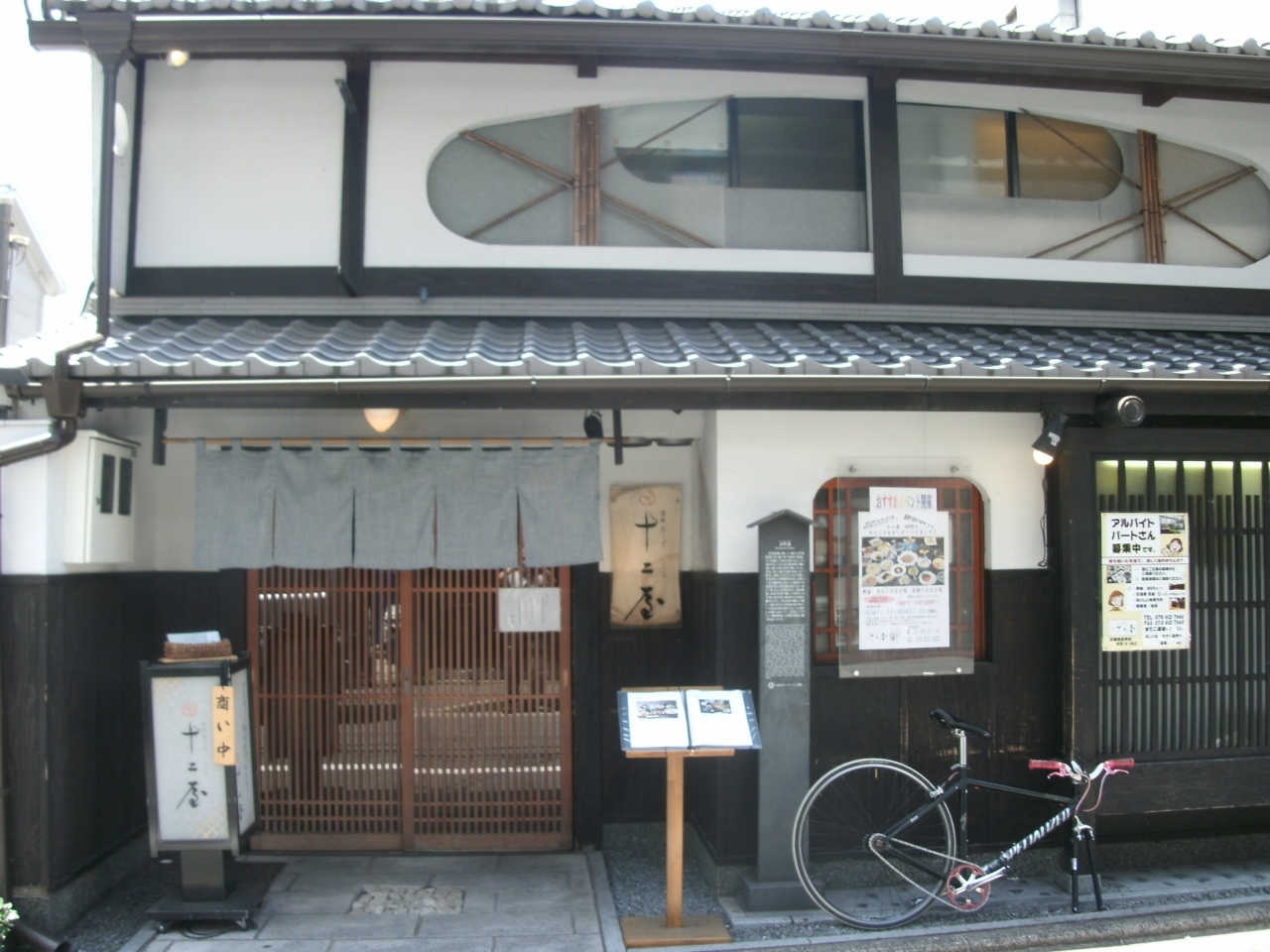「京町おくど 十二屋」さんは、京阪本線の伏見桃山駅を大手筋に出て、1本東側の通り(京町通)を少し下がったところにあります。店構えをみると歴史ある老舗のようですが、平成18年に京町家を改装してオープンされたそうですから比較的新しいお店です。店内に入ると少し照明を落として雰囲気のある演出、結構広くてカウンター席や判個室の席があり、中庭を眺められるようになっていました。なかなか京都らしい雰囲気で、外国人のお客さんもいました。料理は、ランチ限定の“十二屋小町2100円”を頂きました。9枡に分けたお盆の様なものに、それぞれ小さな器が入っておりその中に、お造り・出汁巻・焼魚・野菜の煮物、おひたしなどのおばんざいが入っていました。その他に豆腐、天ぷら、吸い物、ご飯、デザートなどがあり、どれも丁寧に作ってあり美味しかった。一つ一つの量は少ないので、いろんなものを少しずつ食べたいと言う女性や、京都らしい雰囲気を味わいたいと言う観光客には良いお店だと思います。