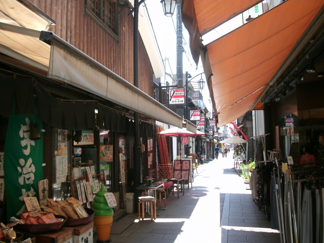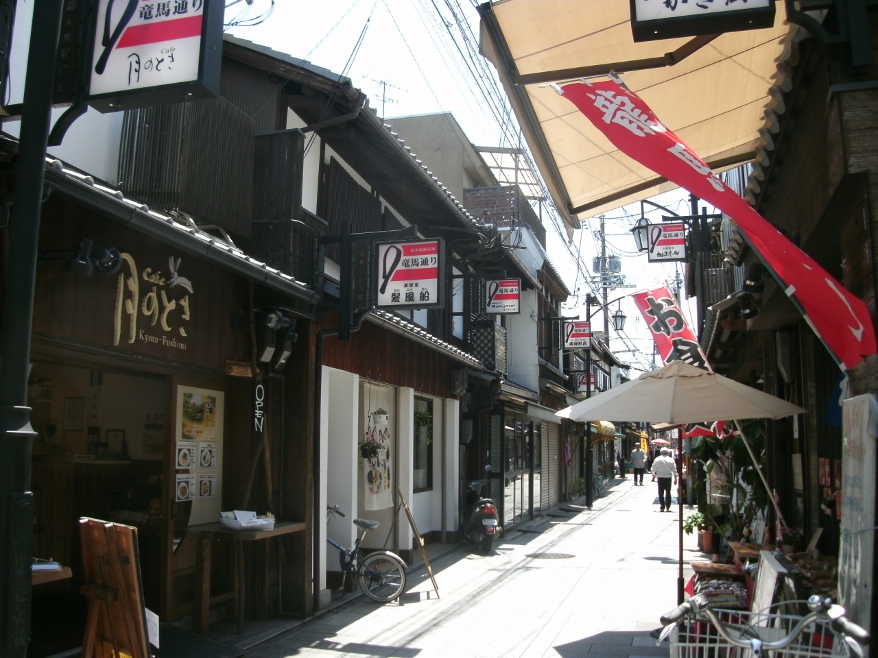 坂本竜馬であまりにも有名な寺田屋のすぐ東に蓬莱橋があります。この橋の北詰から北上する幅約3メートル程の通りが「竜馬通り商店街」です。平成5年にそれまでの南納屋町商店会の法人化を機に「竜馬通り商店街」に名称を変更したもので、石畳の通路や街路灯などが少しレトロな雰囲気の商店街を演出しています。カフェや食事処、土産物店、生花店、野菜・果物店など20数店舗が軒を並べています。また、商店街組合員の共同出資による店舗“龍馬館”では、竜馬のブロンズ像や携帯ストラップなど様々なグッズや土産品、姉妹提携している高知市の「升形商店街」からの商品などを販売しています。寺田屋まで来られた人は、是非、覗いてみて下さい。