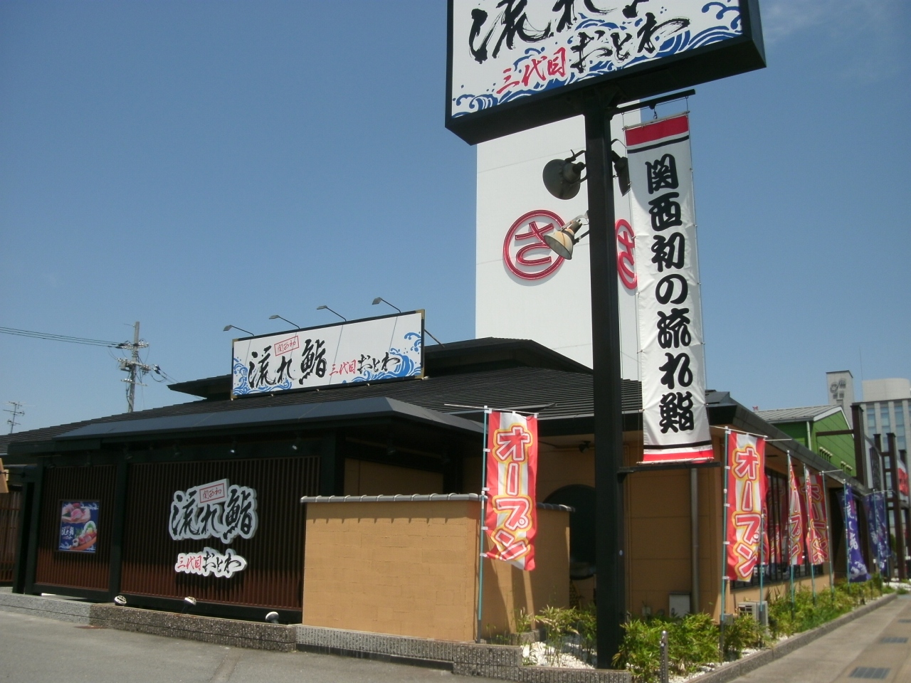 「流れ鮨 三代目おとわ」さんは、国道1号線の横大路の交差点を北に少し行った、左手にあります。広い駐車場があり、入りやすいお店です。店内は、テーブル席が約100席、カウンター席が約14席、座席が約16席と広く、大変綺麗です。注文は各座席に設置されているタッチパネルで行い、注文されてから握られたお寿司がベルトコンベアの様なレーンによって自動的に座席まで運ばれてきます。回転寿司のように握ったものが回っているのでなく、注文したものが“流れてくる”ので「流れ鮨」と言うようです。ハマチ241円、鯵241円、煮穴子504円、イクラ504円、特大サーモン336円、活け帆立504円、金目鯛504円、本鮪大トロ630円など300円~600円位のものが多いです。お寿司単品の他に、握りセットやおつくり、サラダ、天ぷら、唐揚げ、茶碗蒸し、うどん、デザートなどのメニューもあります。値段は100円均一の回転寿司に比べればかなり高いですが、ネタも大きく新鮮で、注文してから握ってもらえるので鮮度感もあります。子供連れの時は100円回転寿司、大人だけのときは“流れ鮨”と使い分けるのも良いかもしれません。