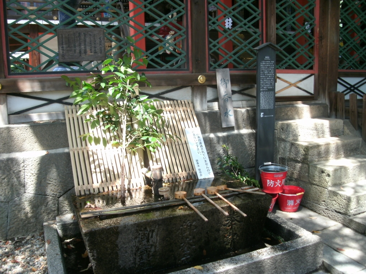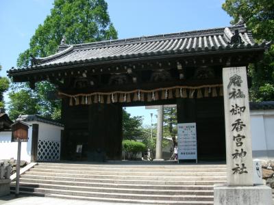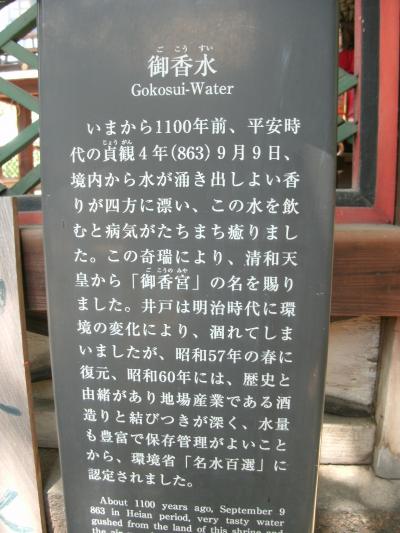 「御香宮神社」は、近鉄京都線の桃山御陵前駅の東、100mほどの所に鎮座されています。平安期、境内から病気に効く香水がわき出たので清和天皇からこの名を賜ったという。桃山期の特色ある建築物のうち表門や極彩色彫刻の本殿は重文にしていされています。神功皇后ほかを祀り、豊臣秀吉は伏見城の守り神としました。境内には、伏見城跡の残石もありました。鳥羽伏見の戦いでは薩摩薩軍の本営になりました。神社の本殿脇に、この神社の名前の由来になった“御香水”が湧き出ています。“御香水”と看板がある所の水は、『この水はろ過されていないので飲まないで下さい。』と書いてあり、その横に、自由に汲めるところがありました。