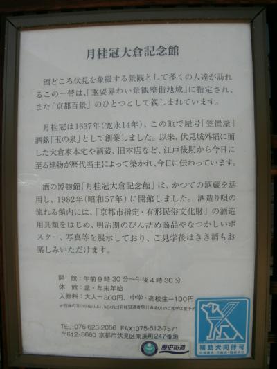 酒蔵の町、伏見は“伏水”と書かれていたほど豊かな水に恵まれたところです。この豊かな伏流水に加え、京都の盆地特有の冬の寒暖の差が酒づくりの伝統を育み、兵庫県の灘と並ぶ屈指の酒どころとなりました。現在でも30数社のメ−カ−があります。昔ながらの建物や酒蔵が並ぶ町には、“月桂冠大倉記念館”や“黄桜記念館(キザクラカッパカントリー)”などお酒に関する資料館などもあります。街中を流れる川には遊覧船もあり、町全体がとても風情があります。