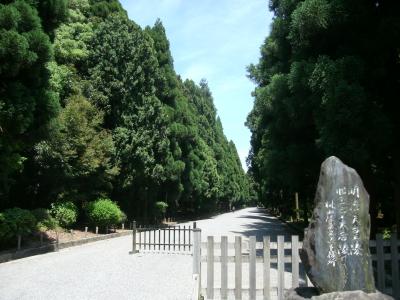 「明治天皇 伏見桃山陵」は、近鉄京都線の桃山御陵駅から東に約1?のところにあります。敷地は豊臣秀吉の築いた伏見城の本丸跡地で、京都に墓所が営まれたのは明治天皇の遺言によるものという。参道には玉砂利が敷かれ、その両側には素晴らしい杉並木が続きます。まわりは大きな森になっていて、鳥のさえずりしか聞こえない静かで荘厳な雰囲気で、心が洗われる思いでした。