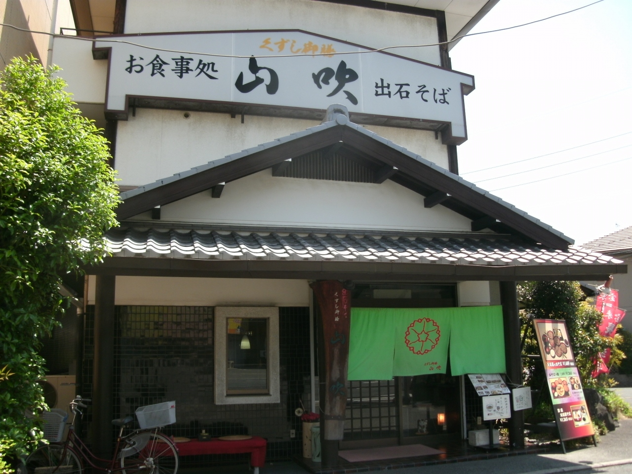 「くずし御膳山吹」さんは、国道9号線が阪急嵐山線を越えて100mほど行った、国道沿いにあります。店名からは判りにくいですが、お蕎麦や鰻をメインにするお店です。特に、京都市内では珍しい“出石の蕎麦”を頂くことが出来ます。出石(いずし)は兵庫県北部の小さな城下町で“皿そば”で有名なところです。出石では何度か“皿そば”を食べたことがあったので、懐かしくて“皿そば 7枚1050円”を頂きました。7枚の小さいお皿に分けられた冷たいそばに山芋、ねぎ、卵、わさびのやくみで頂きます。流石に、出石出身のご主人のこだわりは半端でないことが判るパフォーマンスで、蕎麦の風味も強く、ゆで方もいい具合で噛んだ時の食感も良くて満足できる“皿そば”でした。仕上げに蕎麦湯にやくみに入れて頂きましたが、これが、また良かった。